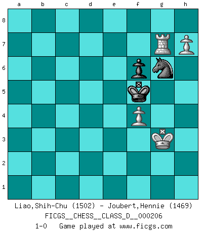 Last move : 1-0 2014 August 9 11:34:5 [Event "FICGS__CHESS__CLASS_D__000206"] [Site "FICGS"] [Date "2014.04.10"] [Round "1"] [White "Liao,Shih-Chu"] [Black "Joubert,Hennie"] [Result "1-0"] [WhiteElo "1502"] [BlackElo "1469"] 1.e4 c5 2.Nf3 e6 3.d4 cxd4 4.Nxd4 Nf6 5.Bd3 Qb6 6.c3 Bc5 7.O-O Bxd4 8.cxd4 Qxd4 9.Nc3 Nc6 10.a3 Qb6 11.b4 a6 12.b5 axb5 13.Be3 Qa5 14.Nxb5 O-O 15.Bd2 Qd8 16.Nd6 Qc7 17.Nxc8 Rfxc8 18.a4 d5 19.exd5 Nxd5 20.Bxh7+ Kxh7 21.Qh5+ Kg8 22.Rfe1 g6 23.Qg4 Nf6 24.Qf3 Nd5 25.Bh6 Qe7 26.Qg3 Ra5 27.Bg5 f6 28.Bh6 Kh7 29.Qh3 Qf7 30.Bd2 Kg8 31.Bxa5 Nxa5 32.Reb1 b6 33.Qg3 Rc3 34.Qb8+ Kg7 35.Rc1 Rxc1+ 36.Rxc1 g5 37.g3 Qd7 38.Rc8 Kh7 39.Rh8+ Kg6 40.Qe8+ Qxe8 41.Rxe8 Kf7 42.Rb8 Nc4 43.Rb7+ Kg6 44.Kg2 Kf5 45.Rg7 Ke5 46.h4 gxh4 47.gxh4 Nf4+ 48.Kf3 Kf5 49.Rh7 Kg6 50.Rc7 Ne5+ 51.Kxf4 Kh5 52.Rh7+ Kg6 53.Rh8 Nd3+ 54.Kg3 Kg7 55.Rb8 Nc5 56.Rxb6 Nxa4 57.Rxe6 Nc5 58.Re7+ Kg6 59.f4 Kf5 60.Rg7 Ne6 61.Rg4 Nf8 62.h5 Nh7 63.Rg7 Nf8 64.h6 Ng6 65.h7 1-0 Sicilian : Anderssen variation Kingside Castling by player White (move 7) Kingside Castling by player Black (move 14) 10 pieces endgame at move 51 : White KRPPP , Black KNPPP WHITE : King + 1 Rook 3 Pawns BLACK : King + 1 Knight 3 Pawns 9 pieces endgame at move 56 : White KRPPP , Black KNPP WHITE : King + 1 Rook 3 Pawns BLACK : King + 1 Knight 2 Pawns 8 pieces endgame at move 56 : White KRPP , Black KNPP WHITE : King + 1 Rook 2 Pawns BLACK : King + 1 Knight 2 Pawns 7 pieces endgame at move 57 : White KRPP , Black KNP WHITE : King + 1 Rook 2 Pawns BLACK : King + 1 Knight 1 Pawn Player White won this chess game. Follow this game move after move (download)Some part of a mistake is always correct. (Savielly Tartakover) Schach sollte überall auf der Welt Schulfach werden. Es fördert die geistige Auseinandersetzung. Es lehrt die Demut in der Niederlage. (Garry Kasparov) El Ajedrez es parte de la cultura, y si una cultura esta en decadencia, entonces también el Ajedrez declinará. (Mikhail Botvinnik) Les Echecs sont affaire de jugement sensible. Savoir quand frapper et quand esquiver. (Fischer) My poor ole parrot... Is not in the circulation of displays ....poo hoo hoo :) (Wayne Lowrance's enigma)