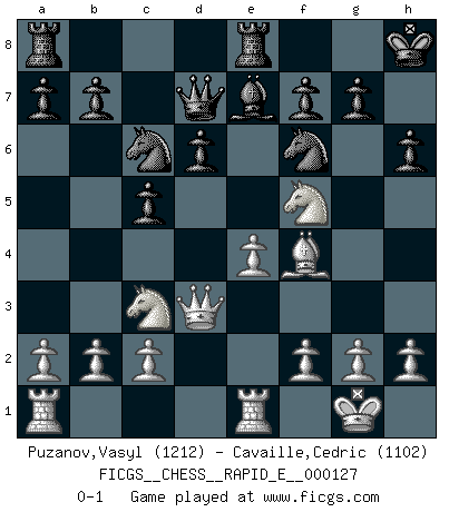 Last move : 0-1 2014 May 31 10:12:42 [Event "FICGS__CHESS__RAPID_E__000127"] [Site "FICGS"] [Date "2014.04.11"] [Round "1"] [White "Puzanov,Vasyl"] [Black "Cavaille,Cedric"] [Result "0-1"] [WhiteElo "1212"] [BlackElo "1102"] 1.e4 e5 2.Nf3 d6 3.d4 exd4 4.Qxd4 Nf6 5.Nc3 c5 6.Bb5+ Bd7 7.Bxd7+ Qxd7 8.Qd3 h6 9.O-O Be7 10.Re1 O-O 11.Nh4 Re8 12.Nf5 Kh8 13.Bf4 Nc6 0-1 This chess game has been lost on time (started : 2014.04.11 9:48:41) Philidor : Exchange variation Kingside Castling by player White (move 9) Kingside Castling by player Black (move 10) Player Black won this chess game. Follow this game move after move (download)If cunning alone were needed to excel, women would be the best Chess players. (Albin) Es gibt nur zwei wahre Schachgenies - das andere war Wilhelm Steinitz, der Weltmeister von 1872 bis 1894. (Robert James Fischer) Fischer era un maestro de claridad y un Rey del posicionamiento astuto. Sus oponentes podían ver hacia donde se dirigía pero eran impotentes para detenerlo. (Bruce Pandolfini) Le pion, dans sa simplicité, marche droit devant lui, mais lorsqu'il prend, il le fait obliquement? Ainsi l'homme, tant qu'il reste pauvre, marche dans la droiture et vit honnêtement, mais lorsqu'il recherche les honneurs, il flatte, se parjure et, par les voies obliques, cherche une position supérieure sur l'échiquier du monde. (Jean de Galles) I take risks, sometimes patients die, but not taking risks causes more patients to die. So I guess my biggest problem is I've been cursed with the ability to do the math. (Gregory House, House M.D.)