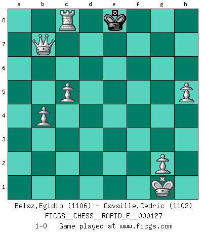 Last move : 1-0 2014 June 2 14:27:49 [Event "FICGS__CHESS__RAPID_E__000127"] [Site "FICGS"] [Date "2014.04.11"] [Round "1"] [White "Belaz,Egidio"] [Black "Cavaille,Cedric"] [Result "1-0"] [WhiteElo "1106"] [BlackElo "1102"] 1.e4 e5 2.Nf3 d6 3.Bc4 h6 4.O-O Nf6 5.d4 exd4 6.Qxd4 c5 7.Qe3 Be7 8.e5 dxe5 9.Nxe5 Be6 10.Bxe6 fxe6 11.Ng6 Rg8 12.Qxe6 Qd7 13.Qe5 Nc6 14.Qe3 Nd4 15.Na3 Qe6 16.Qxe6 Nxe6 17.Re1 Kf7 18.Nxe7 Kxe7 19.Bd2 b6 20.c4 Rad8 21.Bc3 Kf7 22.Nb5 a5 23.Na7 Nd4 24.Bxd4 Rxd4 25.b3 a4 26.Nb5 Rg4 27.Rad1 axb3 28.axb3 Re4 29.Nd6+ Kg6 30.Nxe4 Nxe4 31.Rxe4 Kf5 32.f3 h5 33.Rd5+ Kf6 34.Rd6+ Kf7 35.Rxb6 Re8 36.Rb7+ Kf8 37.Rxe8+ Kxe8 38.Rxg7 Kf8 39.Rg5 Ke7 40.Rxh5 Kd6 41.Rh4 Kc6 42.Rh5 Kb6 43.Rd5 Ka5 44.Rxc5+ Kb4 45.Rb5+ Kc3 46.h4 Kd4 47.f4 Ke4 48.f5 Kd4 49.f6 Ke4 50.f7 Kd4 51.f8Q Kc3 52.h5 Kd3 53.Rd5+ Kc3 54.Qf3+ Kb4 55.c5 Kb5 56.Qd3+ Kc6 57.b4 Kc7 58.Rd6 Kb7 59.Qa6+ Kc7 60.Rc6+ Kd7 61.Qb7+ Ke8 62.Rc8+ 1-0 Philidor's defense Kingside Castling by player White (move 4) 10 pieces endgame at move 38 : White KRPPPPP , Black KPP WHITE : King + 1 Rook 5 Pawns BLACK : King + 2 Pawns 9 pieces endgame at move 40 : White KRPPPPP , Black KP WHITE : King + 1 Rook 5 Pawns BLACK : King + 1 Pawn 8 pieces endgame at move 44 : White KRPPPPP , Black K WHITE : King + 1 Rook 5 Pawns BLACK : King + Promotion Queen by player White (move 51) Player White won this chess game. Follow this game move after move (download)You may learn much more from a game you lose than from a game you win. You will have to lose hundreds of games before becoming a good player. (Jose Raul Capablanca) In der Schule lernt man nichts. Es ist nur Zeitverschwendung. (Robert James Fischer) Cuando tu no sabes absolutamente que mas hacer, es tiempo de entrar en pánico. (John van der Wiel) Même un GMI sait rarement calculer sur plus de cinq coups une attaque à sacrifices. (Rudolf Spielmann) Are you threatening me, Master Jedi ? (Chancellor Palpatine in Star Wars ep.3)