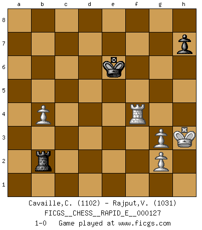 Last move : 1-0 2014 May 14 19:56:20 [Event "FICGS__CHESS__RAPID_E__000127"] [Site "FICGS"] [Date "2014.04.11"] [Round "1"] [White "Cavaille,Cedric"] [Black "Rajput,Vishalsingh"] [Result "1-0"] [WhiteElo "1102"] [BlackElo "1031"] 1.e4 e5 2.Nf3 Nc6 3.Bb5 Nge7 4.d4 exd4 5.Bxc6 Nxc6 6.Nxd4 Nb8 7.c4 Bc5 8.Be3 O-O 9.Nc3 a6 10.a3 Re8 11.b4 Be7 12.Qg4 d6 13.Qg3 Nd7 14.Bh6 g6 15.h4 Ne5 16.h5 Nxc4 17.hxg6 fxg6 18.Nd5 Bf6 19.Nxf6+ Qxf6 20.Qd3 d5 21.O-O g5 22.exd5 Nd6 23.Rac1 Re7 24.Bxg5 Qxg5 25.Qg3 Qxg3 26.fxg3 Bg4 27.Rce1 Rxe1 28.Rxe1 Nb5 29.Nxb5 axb5 30.Re7 c6 31.Rxb7 cxd5 32.Rxb5 Rxa3 33.Rxd5 Rb3 34.Rg5+ Kf7 35.Rxg4 Kf6 36.Kh2 Ke5 37.Kh3 Ke6 38.Kh4 Rb2 39.Re4+ Kf5 40.Rf4+ Ke6 41.Kh3 1-0 Ruy Lopez : Cozio defense Kingside Castling by player Black (move 8) Kingside Castling by player White (move 21) 10 pieces endgame at move 32 : White KRPPP , Black KRBPP WHITE : King + 1 Rook 3 Pawns BLACK : King + 1 Rook 1 Bishop 2 Pawns 9 pieces endgame at move 33 : White KRPPP , Black KRBP WHITE : King + 1 Rook 3 Pawns BLACK : King + 1 Rook 1 Bishop 1 Pawn 8 pieces endgame at move 35 : White KRPPP , Black KRP WHITE : King + 1 Rook 3 Pawns BLACK : King + 1 Rook 1 Pawn Player White won this chess game. Follow this game move after move (download)There's never before been a Chess player with such a thorough knowledge of the intricacies of the game and such an absolutely indomitable will to win. I think Bobby is the greatest player that ever lived. (Lisa Lane) Besser ein falscher Plan, logisch durchgeführt, als gar kein Plan. (Viktor Kortschnoi) La belleza de un movimiento no se refleja solo en su apariencia, sino en el pensamiento detrás de él. (Siegbert Tarrasch) Je ne crois pas en la psychologie, je crois aux bons coups. (Robert Fischer) Life doesn't imitate art, it imitates bad television. (Woody Allen)