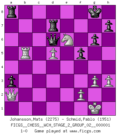 Last move : 1-0 2007 August 12 9:23:55 [Event "FICGS__CHESS__WCH_STAGE_2_GROUP_02__000001"] [Site "FICGS"] [Date "2007.02.15"] [Round "1"] [White "Johansson,Mats"] [Black "Schmid,Pablo"] [Result "1-0"] [WhiteElo "2275"] [BlackElo "1951"] 1.d4 Nf6 2.c4 g6 3.Nc3 d5 4.cxd5 Nxd5 5.e4 Nxc3 6.bxc3 c5 7.Bb5+ Bd7 8.Bxd7+ Qxd7 9.Nf3 Bg7 10.O-O O-O 11.Rb1 Nc6 12.Be3 cxd4 13.cxd4 e6 14.Qd2 b6 15.Rfd1 Na5 16.Bh6 Nc4 17.Qf4 Rac8 18.Bxg7 Kxg7 19.Qg3 Qc7 20.Qg4 Na3 21.Rb3 Qc2 22.Ne1 Qxa2 23.Rh3 Kg8 24.d5 exd5 25.exd5 Nc4 26.Qg5 Rc7 27.Qh6 f5 28.Rhd3 Nd6 29.Nf3 Ne4 30.Qe3 Re8 31.Nd2 Nd6 32.Qf4 Qc2 33.Nf1 Qc5 34.h3 a5 35.Nd2 Rd7 36.Nb3 Qc4 37.Qd2 Nf7 38.Nc1 Rde7 39.Rb3 Qa6 40.Nd3 Nd6 41.Nf4 b5 42.Ne6 Ne4 43.Qd3 Rd7 44.Qf1 Qd6 45.Rxb5 Nc3 46.Rdb1 Nxb1 47.Qxb1 a4 48.Qa1 Ra8 49.Qa2 a3 50.g3 1-0 This chess game has been lost on time (started : 2007.02.15 23:33:41) King's Indian defense, 3.Nc3 Kingside Castling by player White (move 10) Kingside Castling by player Black (move 10) Player White won this chess game. Follow this game move after move (download)If a ruler does not understand Chess, how can he rule over a kingdom ? (King Khusros II) Die Idee von Capablanca, Schach als Fach in den Schulen zu lehren, ist großartig. (Fidel Castro) Haz el enroque temprano y seguido. (Rob Sillars) Le temps de noter son nom sur la feuille de partie, j'étais déjà en zeitnot ! D'un modeste amateur apparié lors de la première ronde d'un open contre le grand-maître Azmaïparashvili. Without deviation from the norm, progress is not possible. (Frank Zappa)