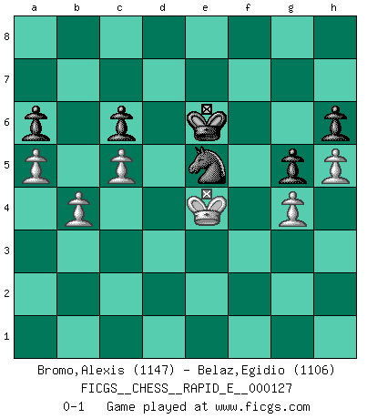 Last move : 0-1 2014 June 4 19:47:59 [Event "FICGS__CHESS__RAPID_E__000127"] [Site "FICGS"] [Date "2014.04.11"] [Round "1"] [White "Bromo,Alexis"] [Black "Belaz,Egidio"] [Result "0-1"] [WhiteElo "1147"] [BlackElo "1106"] 1.d4 e6 2.a3 Nf6 3.c4 Be7 4.Nc3 O-O 5.Nf3 d5 6.e3 c6 7.c5 b6 8.b4 b5 9.a4 a6 10.a5 Ne4 11.Nxe4 dxe4 12.Ne5 f6 13.Nc4 bxc4 14.Bxc4 f5 15.Bb2 Bb7 16.Bxe6+ Kh8 17.Qh5 Bc8 18.Bxc8 Qxc8 19.Rd1 Bf6 20.O-O Qe6 21.f4 Qb3 22.Rb1 Qxe3+ 23.Kh1 Bxd4 24.Bxd4 Qxd4 25.Rfd1 Qf6 26.Rd6 Qe7 27.Re1 Qc7 28.Red1 Ra7 29.Qxf5 Qf7 30.Qxf7 Raxf7 31.g3 Re7 32.Rd8 Ref7 33.Rxf8+ Rxf8 34.Kg2 h6 35.Kf2 Re8 36.Ke3 Kh7 37.Rd4 Kg6 38.Rxe4 Rf8 39.g4 Nd7 40.Re6+ Rf6 41.f5+ Kf7 42.Ke4 Rxe6+ 43.fxe6+ Kxe6 44.h4 g5 45.h5 Ne5 0-1 Queen's pawn Kingside Castling by player Black (move 4) Kingside Castling by player White (move 20) Player Black won this chess game. Follow this game move after move (download)Chess is war over the board. The object is to crush the opponents mind. (Bobby Fischer) Die Idee von Capablanca, Schach als Fach in den Schulen zu lehren, ist großartig. (Fidel Castro) Todavía soy una víctima del Ajedrez. Tiene toda la belleza del arte y mucho mas. No puede ser comercializado. El Ajedrez es mas puro que el arte en su posición social. (Marcel Duchamp) En blitz, le Cavalier l'emporte sur le Fou. (Vlastimil Hort) Think like a man of action, act like a man of thought. (Henri Louis Bergson)