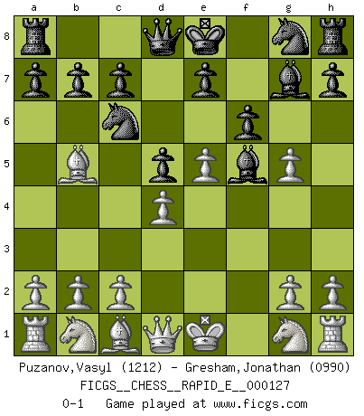 Last move : 0-1 2014 May 31 22:12:13 [Event "FICGS__CHESS__RAPID_E__000127"] [Site "FICGS"] [Date "2014.04.11"] [Round "1"] [White "Puzanov,Vasyl"] [Black "Gresham,Jonathan"] [Result "0-1"] [WhiteElo "1212"] [BlackElo "0990"] 1.e4 Nc6 2.d4 d5 3.e5 Bf5 4.Bb5 f6 5.f4 g5 6.fxg5 Bg7 0-1 This chess game has been lost on time (started : 2014.04.11 9:48:41) KP : Nimzovich defense Player Black won this chess game. Follow this game move after move (download)Look at Garry Kasparov. After he loses, invariably he wins the next game. He just kills the next guy. That's something that we have to learn to be able to do. (Maurice Ashley) Deine Wertungszahl - vorausgesetzt einige Jahre schachliche Anstrengung - entspricht etwa dem zehnfachen Deines IQ plus 1000. (Jonathan Levitt) La enorme capacidad mental, en la que sin ella no puede un jugador de Ajedrez existir, es demasiado requerida por el Ajedrez al grado de que nunca podrá liberar su mente de este juego. (Albert Einstein) C'est une question de caractère, Beaucoup de gens perdent leur motivation très vite. D'autres, ils sont rares, peuvent la conserver très longtemps. J'aime les échecs, encore aujourd'hui je suis heureux d'analyser des parties. J'aime toujours gagner, je déteste encore perdre. Bien jouer est important pour mon intégrité intellectuelle et morale. Et puis les échecs vivent en ce moment une période historique grâce à Internet. Ils se développent dans les systèmes éducatifs à travers le monde. Ils sortent de leur ghetto, et c'est mon rôle de mener à bien cette révolution. (Gary Kasparov) When the going gets tactical, the computers get going. (Hyatt)
