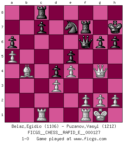 Last move : 1-0 2014 June 25 5:52:5 [Event "FICGS__CHESS__RAPID_E__000127"] [Site "FICGS"] [Date "2014.04.11"] [Round "1"] [White "Belaz,Egidio"] [Black "Puzanov,Vasyl"] [Result "1-0"] [WhiteElo "1106"] [BlackElo "1212"] 1.e4 e5 2.Nf3 Nc6 3.Bc4 Bc5 4.O-O Nf6 5.Ng5 O-O 6.d3 h6 7.Nf3 d6 8.a4 a6 9.Nc3 Be6 10.Bxe6 fxe6 11.Ne2 Nd4 12.Nfxd4 exd4 13.b3 Qe7 14.Bb2 e5 15.Ng3 Qf7 16.Bc1 Qg6 17.Nf5 Rae8 18.Nh4 Qf7 19.Nf5 Kh7 20.Bd2 d5 21.b4 Be7 22.c3 dxc3 23.Bxc3 d4 24.Bd2 Ng8 25.b5 g6 26.Nxe7 Nxe7 27.bxa6 bxa6 28.Bb4 Qf6 29.Rc1 Rc8 30.a5 Rf7 31.Qg4 1-0 Giuoco Piano Kingside Castling by player White (move 4) Kingside Castling by player Black (move 5) Player White won this chess game. Follow this game move after move (download)Fischer is under obligation to nobody. (Joseph Platz) Ein bischen Romantik kann weder im Schach noch in der Liebe schaden. Also versuche ich mich ab und zu daran zu erinnern. (Nigel Short) Alekhine es un poeta que crea un trabajo de arte de algo que raramente inspiraría a otra persona a mandar una tarjeta postal. (Max Euwe) Mon pion favori sur ma case favorite ! Bronstein en parlant d'un coup de pion en h5 quand il avait les Noirs. Perseverance does not equal worthiness. Next time you want to get my attention, wear something fun. Low-riding jeans are hot. (Gregory House, House M.D.)