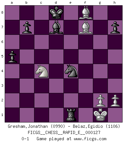 Last move : 0-1 2014 June 2 0:59:38 [Event "FICGS__CHESS__RAPID_E__000127"] [Site "FICGS"] [Date "2014.04.11"] [Round "1"] [White "Gresham,Jonathan"] [Black "Belaz,Egidio"] [Result "0-1"] [WhiteElo "0990"] [BlackElo "1106"] 1.e4 c5 2.d4 cxd4 3.c3 dxc3 4.Bc4 cxb2 5.Bxb2 e6 6.f4 Nc6 7.Nf3 Be7 8.Bxg7 Bf6 9.Bxh8 Bxa1 10.Bxa1 d6 11.O-O Bd7 12.Qxd6 Rc8 13.Nbd2 Qe7 14.Qxe7+ Ncxe7 15.f5 exf5 16.exf5 Nxf5 17.Ne5 Ne3 18.Bxf7+ Ke7 19.Re1 Nc2 20.Rc1 Nf6 21.Bb2 a5 22.Rxc2 Rxc2 23.Ba3+ Kd8 24.Nec4 Rxa2 25.Nf3 Ne4 26.Bf8 Ra1+ 27.Ne1 Rxe1+ 0-1 Sicilian : Smith-Morra gambit Kingside Castling by player White (move 11) Player Black won this chess game. Follow this game move after move (download)Human affairs are like a Chess game: only those who do not take it seriously can be called good players. (Hung Tzu Ch'eng) Matt entspricht nicht immer den Tatsachen. (Savielly Grigorievitsch Tartakower) Cada Peón es potencialmente una Reina. (James Mason) Dieu déplace le joueur, et celui-ci la pièce. Quel Dieu derrière Dieu commence donc la trame ? Arturo Perez-Reverte (prix de littérature policière 1993). Faith : not wanting to know what is true. (Friedrich Nietzsche)
