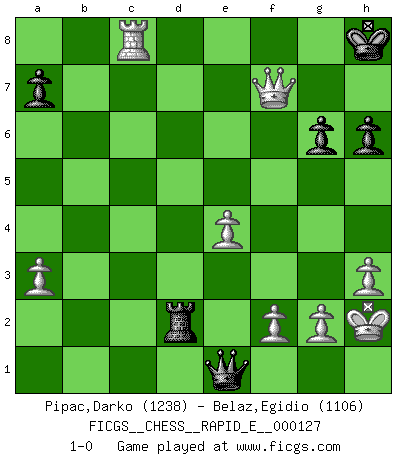 Last move : 1-0 2014 May 23 19:4:58 [Event "FICGS__CHESS__RAPID_E__000127"] [Site "FICGS"] [Date "2014.04.11"] [Round "1"] [White "Pipac,Darko"] [Black "Belaz,Egidio"] [Result "1-0"] [WhiteElo "1238"] [BlackElo "1106"] 1.e4 e5 2.Nf3 d6 3.c3 Nf6 4.Qe2 Bg4 5.h3 Bd7 6.d4 Nc6 7.Bg5 Be7 8.dxe5 dxe5 9.Qc4 Be6 10.Qa4 Bd7 11.Bb5 O-O 12.Qc4 Na5 13.Qd3 c6 14.Bc4 Nxc4 15.Qxc4 Be6 16.Qe2 Nh5 17.Bxe7 Qxe7 18.Nxe5 Nf4 19.Qf3 Qf6 20.Nd3 Nxd3+ 21.Qxd3 Rfd8 22.Qe3 b5 23.O-O h6 24.b3 Rdc8 25.Nd2 c5 26.c4 bxc4 27.bxc4 Qd8 28.Rab1 Qa5 29.a3 Rd8 30.Rfd1 Rac8 31.Rb5 Qa4 32.Rc1 Bxc4 33.Rxc5 Rxc5 34.Qxc5 Rxd2 35.Rxc4 Qd1+ 36.Kh2 Qe1 37.Qc8+ Kh7 38.Qf5+ g6 39.Qxf7+ Kh8 40.Rc8+ 1-0 Philidor's defense Kingside Castling by player Black (move 11) Kingside Castling by player White (move 23) Player White won this chess game. Follow this game move after move (download)Fischer is the strongest player in the world. In fact, the strongest player who ever lived. (Larry Evans) Dein Körper muss in Topform sein. Dein Schach verfällt, wenn dein Körper verfällt. Der Körper kann nicht vom Geist getrennt werden. (Robert James Fischer) La belleza de un movimiento no se refleja solo en su apariencia, sino en el pensamiento detrás de él. (Siegbert Tarrasch) Les Echecs sont et restent toujours un combat, un combat intégral comme la boxe, la lutte ou un autre sport, et où il doit y avoir un vainqueur et un vaincu. (Joseph Emil Diemer) Pushing plastic is for the many, pushing virtual pieces is for the fewer, pushing wood is for the very few. (Normajean Yates)