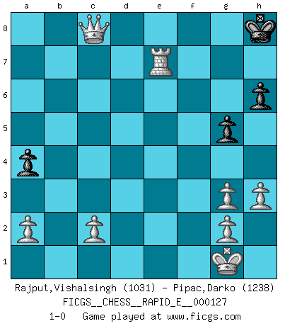 Last move : 1-0 2014 June 7 6:33:24 [Event "FICGS__CHESS__RAPID_E__000127"] [Site "FICGS"] [Date "2014.04.11"] [Round "1"] [White "Rajput,Vishalsingh"] [Black "Pipac,Darko"] [Result "1-0"] [WhiteElo "1031"] [BlackElo "1238"] 1.e4 e5 2.Nf3 Nc6 3.Bc4 h6 4.O-O Nf6 5.Nc3 Bb4 6.Bd5 Bxc3 7.dxc3 d6 8.h3 Qe7 9.Bd2 O-O 10.Re1 Be6 11.c4 Nd4 12.Nxd4 exd4 13.e5 Nd7 14.exd6 Qxd6 15.Qe2 Rfe8 16.Bf3 Nc5 17.b4 d3 18.bxc5 dxe2 19.cxd6 Bxc4 20.dxc7 Rac8 21.Bf4 g6 22.Bxb7 g5 23.Bxc8 Rxc8 24.Bg3 f5 25.Rab1 f4 26.Rb8 Rxb8 27.cxb8Q+ Kf7 28.Qc7+ Kf8 29.Qxc4 fxg3 30.fxg3 a5 31.Rxe2 Kg7 32.Re6 Kh8 33.Re7 a4 34.Qc8+ 1-0 King's pawn game Kingside Castling by player White (move 4) Kingside Castling by player Black (move 9) Promotion Queen by player White (move 27) Player White won this chess game. Follow this game move after move (download)The mistakes are there, waiting to be made. (Savielly Tartakower) Sitze auf Deine Hände. (Siegbert Tarrasch) Los Peones son nacidos libres, y aún así, se encuentran por doquier encadenados. (Rick Kennedy) Les échecs, c'est la lutte contre l'erreur. (Johannes Zukertort) Horse racing is animated roulette. (Roger Kahn)