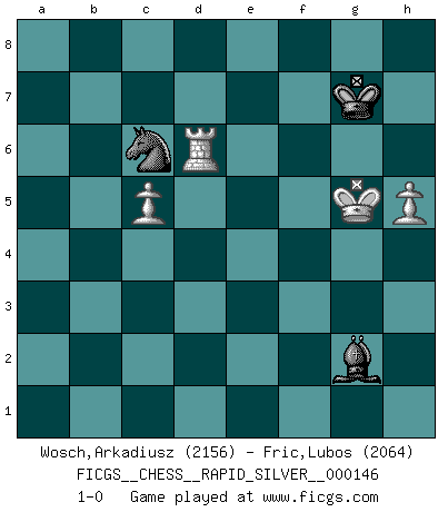 Last move : 1-0 2014 October 19 21:23:30 [Event "FICGS__CHESS__RAPID_SILVER__000146"] [Site "FICGS"] [Date "2014.04.12"] [Round "2"] [White "Wosch,Arkadiusz"] [Black "Fric,Lubos"] [Result "1-0"] [WhiteElo "2156"] [BlackElo "2064"] 1.e4 e5 2.Nf3 Nc6 3.Bb5 a6 4.Ba4 Nf6 5.O-O Be7 6.Re1 b5 7.Bb3 d6 8.c3 O-O 9.h3 Nb8 10.d4 Nbd7 11.Nbd2 Bb7 12.Bc2 Re8 13.Nf1 Bf8 14.Ng3 g6 15.a4 c5 16.d5 c4 17.Bg5 Be7 18.Nh2 Nxd5 19.Bxe7 Nxe7 20.Qxd6 Nc8 21.Qd2 Nc5 22.Qe3 Qc7 23.axb5 axb5 24.Rxa8 Bxa8 25.Ng4 Re6 26.Rd1 f6 27.h4 Ne7 28.Qh6 Nd7 29.Ne3 Rd6 30.Ra1 Nb6 31.Nef5 gxf5 32.Nh5 Ng6 33.exf5 Nf8 34.Nxf6+ Kf7 35.Bd1 Rxd1+ 36.Rxd1 Qc6 37.f3 Qxf6 38.Qxf6+ Kxf6 39.Rd6+ Kxf5 40.Rxb6 Ng6 41.Rxb5 Ke6 42.Rb6+ Kf7 43.Ra6 Bd5 44.Ra7+ Ne7 45.Kf2 Kf6 46.h5 e4 47.fxe4 Bxe4 48.g4 h6 49.Ra6+ Nc6 50.Rb6 Bd5 51.Ke3 Bg2 52.Kf4 Bd5 53.b4 cxb3 54.c4 Bg2 55.Rxb3 Nd8 56.Rb6+ Bc6 57.Ke3 Kg7 58.Kd4 Ne6+ 59.Ke5 Nd8 60.c5 Kf7 61.Kd6 Bf3 62.Rb4 Kg7 63.Rf4 Bg2 64.Ke7 Nc6+ 65.Kd7 Bf3 66.Kd6 Bg2 67.Rf2 Bh1 68.Rf1 Bg2 69.Re1 Bf3 70.Re3 Bg2 71.Re6 Na5 72.Ke5 Nc6+ 73.Kf4 Nd8 74.Rd6 Nc6 75.g5 hxg5+ 76.Kxg5 1-0 Ruy Lopez : Closed Kingside Castling by player White (move 5) Kingside Castling by player Black (move 8) 10 pieces endgame at move 53 : White KRPPP , Black KBNPP WHITE : King + 1 Rook 3 Pawns BLACK : King + 1 Bishop 1 Knight 2 Pawns 9 pieces endgame at move 55 : White KRPPP , Black KBNP WHITE : King + 1 Rook 3 Pawns BLACK : King + 1 Bishop 1 Knight 1 Pawn 8 pieces endgame at move 75 : White KRPP , Black KBNP WHITE : King + 1 Rook 2 Pawns BLACK : King + 1 Bishop 1 Knight 1 Pawn 7 pieces endgame at move 76 : White KRPP , Black KBN WHITE : King + 1 Rook 2 Pawns BLACK : King + 1 Bishop 1 Knight Player White won this chess game. Follow this game move after move (download)Via the squares on the chessboard, the Indians explain the movement of time and the age, the higher influences which control the world and the ties which link Chess with the human soul. (Al-Masudi) Die Partien sind immer verschieden, die Interviews immer die gleichen. (Garry Kasparov) Me siento como si fuera una pieza en una partida de Ajedrez, cuando mi oponente me indica: esa pieza no puede ser movida. (Soren Kierkegaard) Le génie consiste à savoir transgresser les règles au moment opportun. (Teichmann) When a man with money meets a man with experience, the man with experience leaves with money and the man with money leaves with experience. (Anonymous)