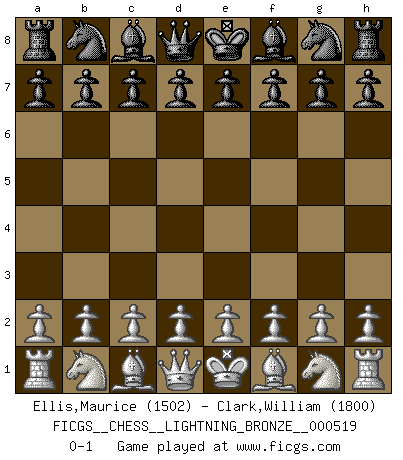 Last move : 0-1 2014 April 13 7:51:0 [Event "FICGS__CHESS__LIGHTNING_BRONZE__000519"] [Site "FICGS"] [Date "2014.04.13"] [Round "1"] [White "Ellis,Maurice"] [Black "Clark,William"] [Result "0-1"] [WhiteElo "1502"] [BlackElo "1800"] 0-1 This chess game has been lost on time (started : 2014.04.13 4:7:52) Player Black won this chess game. Follow this game move after move (download)Chess makes man wiser and clear-sighted. (Vladimir Putin) Rauchen ist dem Schachspieler bei seiner Arbeit, also im Wettkampf, untersagt. (Viktor Kortschnoi) Ciertamente el estado mental actual de Bobby Fischer es una tragedia. Uno de los mas grandes jugadores de Ajedrez del mundo -el orgullo y pena del Ajedrez Americano. (Frank Brady) Si rien de grave n'est détecté lors de l'analyse d'une position, on joue alors le coup. Seconde règle de Blumenfeld. Beta. Software undergoes beta testing shortly before it's released. Beta is latin for still doesn't work. (Anonymous)