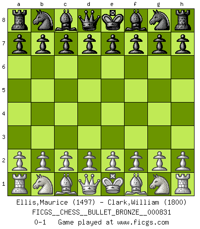 Last move : 0-1 2014 April 13 21:57:44 [Event "FICGS__CHESS__BULLET_BRONZE__000831"] [Site "FICGS"] [Date "2014.04.13"] [Round "1"] [White "Ellis,Maurice"] [Black "Clark,William"] [Result "0-1"] [WhiteElo "1497"] [BlackElo "1800"] 0-1 This chess game has been lost on time (started : 2014.04.13 21:39:40) Player Black won this chess game. Follow this game move after move (download)If you aren't afraid of Spassky, then I have removed the element of money. (Jim Slater) Wenn ich gewinne bin ich ein Genie. Wenn nicht, dann bin ich keines. (Robert James Fischer) Hoy en día, si tu no eres un Gran Maestro a los 14 años, es mejor que lo olvides. (Anand Viswanathan) La vérité est comme le meilleur coup aux échecs : elle existe, mais il faut la chercher. (Arturo Perez-Reverte) Nothing is more important for teaching us to understand the concepts we have than constructing fictitious ones. (Ludwig Wittgenstein)