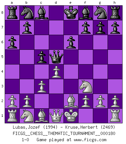 Last move : 1-0 2014 April 23 21:37:49 [Event "FICGS__CHESS__THEMATIC_TOURNAMENT__000180"] [Site "FICGS"] [Date "2014.04.15"] [Round "1"] [White "Lubas,Jozef"] [Black "Kruse,Herbert"] [Result "1-0"] [WhiteElo "1994"] [BlackElo "2469"] 1.e4 c5 2.Nf3 a6 3.c3 d5 4.exd5 Qxd5 5.d4 e6 6.Be2 1-0 Sicilian : O'Kelly variation Player White won this chess game. Follow this game move after move (download)I am still a victim of Chess. It has all the beauty of art and much more. It cannot be commercialized. Chess is much purer than art in its social position. (Marcel Duchamp) Ich hatte meine größten Erfolge, als ich 47 Jahre alt war. Kasparow war noch nicht mal 42 und hat das Schach schon im Stich gelassen. (Viktor Kortschnoi) Los tropiezos estan todos ahí en el tablero, esperando que se cometan. (Savielly Tartakover) Mon pion favori sur ma case favorite ! Bronstein en parlant d'un coup de pion en h5 quand il avait les Noirs. I find your interest interesting. (Gregory House, House M.D.)
