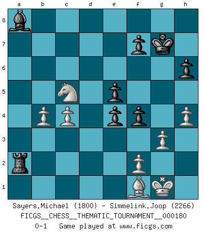 Last move : 0-1 2014 April 21 21:23:43 [Event "FICGS__CHESS__THEMATIC_TOURNAMENT__000180"] [Site "FICGS"] [Date "2014.04.15"] [Round "1"] [White "Sayers,Michael"] [Black "Simmelink,Joop"] [Result "0-1"] [WhiteElo "1800"] [BlackElo "2266"] 1.e4 c5 2.Nf3 a6 3.g3 Nc6 4.d4 cxd4 5.Nxd4 e6 6.Nc3 Qc7 7.Bg2 d6 8.Nxc6 bxc6 9.O-O Nf6 10.Bg5 Be7 11.e5 dxe5 12.Bxf6 gxf6 13.Qg4 Kf8 14.Qh5 h6 15.Rad1 f5 16.b3 Rb8 17.Na4 a5 18.Rfe1 Kg7 19.Re3 e4 20.c4 Rd8 21.Rxd8 Bxd8 22.Re1 Bf6 23.Rd1 c5 24.Qe2 Bd4 25.Qd2 Qe5 26.Qxa5 Bb7 27.Rxd4 Qxd4 28.Qxc5 Qa1+ 29.Bf1 Rd8 30.Qe3 Rd3 31.Qe2 Rd1 32.Qb2+ Qxb2 33.Nxb2 Rd2 34.Na4 Rxa2 35.Nc5 Ba8 36.b4 e5 37.h4 f4 0-1 Joop Simmelink thanks for the game! Sicilian : O'Kelly variation Kingside Castling by player White (move 9) Player Black won this chess game. Follow this game move after move (download)Those who say they understand Chess, understand nothing. (Robert Hubner) Obendrein hat der FIDE-Präsident den Revolutionsführer Gaddafi zum »Großmeister« ernannt, am Ende der WM. Das ist lächerlich! (Joel Lautier) Tu no necesitas jugar muy bien, únicamente ayudar a tu oponenet a que juegue muy mal. (Genrikh Chepukaitis) Une platitude souvent récitée à propos des Echecs est qu'une des choses les plus difficiles à réaliser est de gagner une position gagnante. Cela ne manque pas de sens mais, pour ma part, j'ai toujours trouvé plus difficile de gagner une position perdante. (Tim Krabbe) Luck is when opportunity knocks and you answer. (Anonymous)
