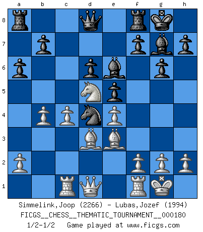 Last move : 1/2-1/2 2014 May 4 18:44:2 [Event "FICGS__CHESS__THEMATIC_TOURNAMENT__000180"] [Site "FICGS"] [Date "2014.04.15"] [Round "1"] [White "Simmelink,Joop"] [Black "Lubas,Jozef"] [Result "1/2-1/2"] [WhiteElo "2266"] [BlackElo "1994"] 1.e4 c5 2.Nf3 a6 3.c4 Nc6 4.d4 cxd4 5.Nxd4 Nf6 6.Nc3 e5 7.Nf5 d6 8.Bd3 g6 9.Ne3 Bg7 10.O-O O-O 11.Ned5 Nxd5 12.Nxd5 Nd4 13.Be3 Be6 14.Rc1 Qa5 15.b4 Qd8 1/2-1/2 Sicilian : O'Kelly variation Kingside Castling by player White (move 10) Kingside Castling by player Black (move 10) This chess game ended in a draw. Follow this game move after move (download)It began to feel as though you were playing against Chess itself. - On playing against Robert Fischer. (Walter Shipman) Ich habe die Schachforschung dermaßen betrieben, dass sie auf eine wissenschaftliche Basis gestellt wurde. (Mikhail Moiseyevich Botvinik) El Ajedrez es un cuento de Hadas de las 1001 metidas de pata. (Savielly Tartakower) Le moment que je préfère le plus dans une rencontre, c'est celui où je sens que la personnalité de l'adversaire se brise. (Robert Fischer) Happy endings are just stories that haven't finished yet. (Jane Smith in Mr & Mrs Smith)