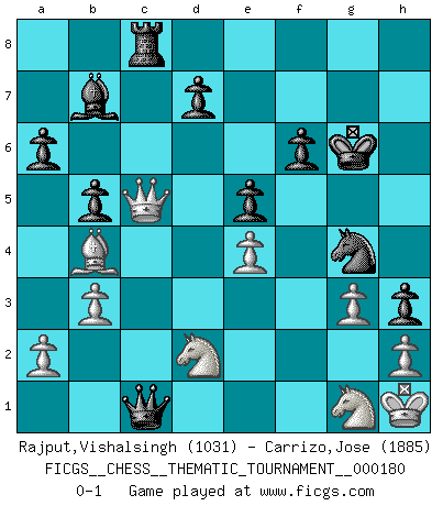 Last move : 0-1 2014 October 4 21:18:15 [Event "FICGS__CHESS__THEMATIC_TOURNAMENT__000180"] [Site "FICGS"] [Date "2014.04.15"] [Round "1"] [White "Rajput,Vishalsingh"] [Black "Carrizo,Jose"] [Result "0-1"] [WhiteElo "1031"] [BlackElo "1885"] 1.e4 c5 2.Nf3 a6 3.Bd3 Nc6 4.O-O e6 5.Re1 g5 6.Kh1 h5 7.Re3 b5 8.b3 Bg7 9.c3 Bb7 10.Bc2 Nb4 11.d4 Nxc2 12.Qxc2 g4 13.Ng1 cxd4 14.cxd4 Bxd4 15.Bb2 Rc8 16.Qd2 Bxe3 17.Qxe3 f6 18.Nd2 h4 19.f3 Rc2 20.Bc3 h3 21.g3 gxf3 22.Ngxf3 Qc7 23.Bd4 Rc1+ 24.Rxc1 Qxc1+ 25.Ng1 e5 26.Bc3 Nh6 27.Qc5 Ng4 28.Bb4 Kf7 29.Qe7+ Kg6 30.Qc5 Rc8 0-1 Sicilian : O'Kelly variation Kingside Castling by player White (move 4) Player Black won this chess game. Follow this game move after move (download)I believe that Chess possesses a magic that is also a help in advanced age. A rheumatic knee is forgotten during a game of Chess and other events can seem quite unimportant in comparison with a catastrophe on the chessboard. (Vlastimil Hort) Frage: Gibt es etwas was Sie mehr lieben als Autobahnen ohne Tempobegrenzungen? - Antwort: Deutsche Frauen ohne Tempobegrenzungen. (Loek van Wely) Las leyes del Ajedrez no permiten una libre elección: tienes que mover quieras o no. (Emanuel Lasker) Les Echecs sont et restent toujours un combat, un combat intégral comme la boxe, la lutte ou un autre sport, et où il doit y avoir un vainqueur et un vaincu. (Joseph Emil Diemer) Success without honor is an unseasoned dish; it will satisfy your hunger, but it won't taste good. (Joe Paterno)