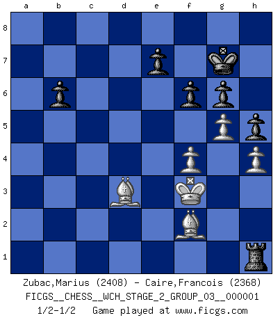 Last move : 1/2-1/2 2007 June 14 3:24:19 [Event "FICGS__CHESS__WCH_STAGE_2_GROUP_03__000001"] [Site "FICGS"] [Date "2007.02.15"] [Round "1"] [White "Zubac,Marius"] [Black "Caire,Francois"] [Result "1/2-1/2"] [WhiteElo "2408"] [BlackElo "2368"] 1.d4 Nf6 2.c4 g6 3.Nc3 d5 4.cxd5 Nxd5 5.e4 Nxc3 6.bxc3 Bg7 7.Bc4 c5 8.Ne2 O-O 9.Be3 Nc6 10.Rc1 cxd4 11.cxd4 Qa5+ 12.Kf1 Qa3 13.Rc3 Qd6 14.h4 Nxd4 15.e5 Bxe5 16.Bxd4 Bf5 17.f4 Bg7 18.Kf2 Rfd8 19.Bxg7 Qxd1 20.Rxd1 Rxd1 21.Bb3 R1d8 22.Bd4 b6 23.Ke3 Rac8 24.Rxc8 Bxc8 25.Nc3 Bd7 26.g3 Kf8 27.a4 Rc8 28.Bd1 f6 29.g4 Kf7 30.Be2 Kg7 31.g5 Rc6 32.Nb5 h5 33.Nxa7 Re6+ 34.Kf3 Bxa4 35.Bc4 Rd6 36.Ke3 Bd7 37.Nb5 Bxb5 38.Bxb5 Re6+ 39.Kf3 Re1 40.Bd3 Rh1 41.Bf2 1/2-1/2 King's Indian defense, 3.Nc3 Kingside Castling by player Black (move 8) This chess game ended in a draw. Follow this game move after move (download)Combinations have always been the most intriguing aspect of Chess. The masters look for them, the public applauds them, the critics praise them. It is because combinations are possible that Chess is more than a lifeless mathematical exercise. They are the poetry of the game; they are to Chess what melody is to music. They represent the triumph of mind over matter. (Reuben Fine) Fischer machte Schach einfach zu einer aufregenden Sache, wann immer er sich ans Brett setzte. (Raymond Keene) Cuando la partida de Ajedrez termina, el Peón y el Rey regresan a la misma caja. (Irish saying) Ce n'est pas pour s'amuser qu'il joue aux échecs : il célèbre un culte. (Vladimir Nabokov) It is the aim of the modern school, not to treat every position according to one general law, but according to the principle inherent in the position. (Richard Reti)