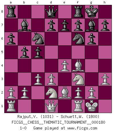 Last move : 1-0 2014 June 11 23:1:5 [Event "FICGS__CHESS__THEMATIC_TOURNAMENT__000180"] [Site "FICGS"] [Date "2014.04.15"] [Round "1"] [White "Rajput,Vishalsingh"] [Black "Schuett,Wilhelm"] [Result "1-0"] [WhiteElo "1031"] [BlackElo "1800"] 1.e4 c5 2.Nf3 a6 3.Bc4 b5 4.Be2 Bb7 5.d3 g6 6.Bf4 Bg7 7.c3 Nf6 8.O-O O-O 9.Nbd2 Nc6 10.h3 1-0 This chess game has been lost on time (started : 2014.04.15 19:33:35) Sicilian : O'Kelly variation Kingside Castling by player White (move 8) Kingside Castling by player Black (move 8) Player White won this chess game. Follow this game move after move (download)Chess is so inspiring that I do not believe a good player is capable of having an evil thought during the game. (Wilhelm Steinitz) Es hat in meinem Leben Zeiten gegeben, in denen das Schachspiel, wenn nicht zum Lebenszweck, so doch zu einem regelrechten Lebensersatz geworden ist. Man fühlt sich in solchen Zeiten nicht so, als besäße man eine göttliche Gabe, sondern eher so, als sei man von ihr besessen. (Garry Kasparov) ¡Examina movidas que hagan daño! Un buen ojo for movidas desvastantes es mucho mas importante que el conocimiento de principios estratégicos. (Purdy) Si rien de grave n'est détecté lors de l'analyse d'une position, on joue alors le coup. Seconde règle de Blumenfeld. Perfection is achieved, not when there is nothing more to add, but when there is nothing left to take away. (Antoine de Saint-Exupéry)