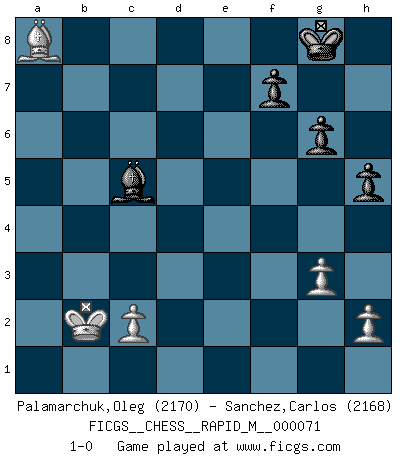 Last move : 1-0 2014 October 3 21:15:40 [Event "FICGS__CHESS__RAPID_M__000071"] [Site "FICGS"] [Date "2014.04.18"] [Round "1"] [White "Palamarchuk,Oleg"] [Black "Sanchez,Carlos"] [Result "1-0"] [WhiteElo "2170"] [BlackElo "2168"] 1.e4 e5 2.Nf3 Nc6 3.Bb5 Nf6 4.Nc3 Nd4 5.Ba4 c6 6.Nxe5 d6 7.Nf3 Bg4 8.d3 Bh5 9.Rg1 b5 10.Bb3 a5 11.a3 d5 12.Bg5 Be7 13.g4 Bxg4 14.Rxg4 Nxf3+ 15.Qxf3 Nxg4 16.Bf4 Nf6 17.exd5 a4 18.Ba2 cxd5 19.O-O-O O-O 20.Rg1 Ra6 21.Nxb5 Qd7 22.Nc3 d4 23.Bc4 dxc3 24.Bxa6 Qf5 25.Bb7 cxb2+ 26.Kb1 Qc5 27.d4 Qxd4 28.Bh6 Ne8 29.Bc6 Qd6 30.Bf4 Qf6 31.Bg3 Qxf3 32.Bxf3 Bxa3 33.Rd1 Nf6 34.Bc6 g6 35.Rd4 Nh5 36.Rxa4 Nxg3 37.fxg3 Bc5 38.Kxb2 h5 39.Ra8 Rxa8 40.Bxa8 1-0 This chess game has been lost on time (started : 2014.04.18 1:8:11) Ruy Lopez : Berlin defense Queenside Castling by player White (move 19) Kingside Castling by player Black (move 19) 10 pieces endgame at move 40 : White KBPPP , Black KBPPP WHITE : King + 1 Bishop 3 Pawns BLACK : King + 1 Bishop 3 Pawns Player White won this chess game. Follow this game move after move (download)Everything is in a state of flux, and this includes the world of Chess. (Mikhail Botvinnik) Es ist peinlich, dass ich nie Weltmeister wurde. Es wäre leicht, Leonid Breschnjew als Ursache vorzuschieben, dessen Apparat den Vorzeigekommunisten Anatoli Karpow in allem unterstützte. Aber Garri Kasparow zum Beispiel, der ebenfalls von den Sowjets unerwünscht war, hat trotz der Widerstände den WM-Titel erobert. (Viktor Kortschnoi) No todos los artistas son jugadores de Ajedrez, pero todos los jugadores de Ajedrez son artistas. (Marcel Duchamp) Dieu déplace le joueur, et celui-ci la pièce. Quel Dieu derrière Dieu commence donc la trame ? Arturo Perez-Reverte (prix de littérature policière 1993). All battles are fought by scared men who'd rather be someplace else. (John Wayne in the movie In harm's way)