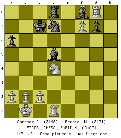 Last move : 1/2-1/2 2014 August 18 16:53:43 [Event "FICGS__CHESS__RAPID_M__000071"] [Site "FICGS"] [Date "2014.04.18"] [Round "1"] [White "Sanchez,Carlos"] [Black "Broniek,Mariusz Maciej"] [Result "1/2-1/2"] [WhiteElo "2168"] [BlackElo "2121"] 1.e4 c5 2.Nf3 d6 3.d4 cxd4 4.Nxd4 Nf6 5.Nc3 a6 6.Be3 e6 7.f3 b5 8.Qd2 Nbd7 9.g4 b4 10.Nce2 h6 11.O-O-O Qc7 12.h4 d5 13.Bf4 e5 14.Bh2 dxe4 15.g5 hxg5 16.hxg5 Rxh2 17.Rxh2 exd4 18.Rh8 Nd5 19.Qxd4 Bb7 20.fxe4 N5b6 21.Qxb4 O-O-O 22.Qd4 Qc4 23.Kb1 Qxd4 24.Nxd4 Ne5 25.Bh3+ Nbd7 26.Rg8 Kc7 27.Bxd7 Nxd7 28.g6 Bxe4 29.gxf7 Bd5 30.Nb5+ Kc6 31.Nd4+ Kc7 1/2-1/2 Sicilian : Najdorf, Byrne (English) attack Queenside Castling by player White (move 11) Queenside Castling by player Black (move 21) This chess game ended in a draw. Follow this game move after move (download)I played Chess with him and would have beaten him sometimes only he always took back his last move, and ran the game out differently. (Mark Twain) Schach verlangt totale Konzentration. (Robert James Fischer) Ayuda a tus piezas para que ellas te puedan ayudar. (Paul Morphy) Ne tendez aucun piège pour le plaisir ! Ne jouez rien dans l'espoir que l'adversaire réagisse de façon stupide ! Prenez toujours pour acquis que l'adversaire va trouver le meilleur coup ! Ne jouez jamais de coup dans l'espoir que l'adversaire ne voie pas la menace ! Chacun de vos coups doit améliorer la position d'une façon ou d'une autre. The beginning is the most important part of the work. (Plato)