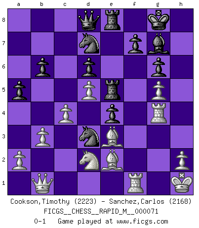 Last move : 0-1 2014 August 19 17:35:6 [Event "FICGS__CHESS__RAPID_M__000071"] [Site "FICGS"] [Date "2014.04.18"] [Round "1"] [White "Cookson,Timothy"] [Black "Sanchez,Carlos"] [Result "0-1"] [WhiteElo "2223"] [BlackElo "2168"] 1.e4 c5 2.Nf3 d6 3.d4 cxd4 4.Nxd4 Nf6 5.Nc3 a6 6.Be3 e5 7.Nb3 Be6 8.f3 h5 9.Qd2 Nbd7 10.Nd5 Bxd5 11.exd5 g6 12.Be2 Bg7 13.O-O b6 14.c4 O-O 15.Rae1 Qc7 16.Kh1 Rab8 17.g4 hxg4 18.fxg4 a5 19.g5 Ne4 20.Qc2 Nec5 21.Nd2 e4 22.Rf4 Rbe8 23.b3 Re5 24.Ref1 Qd8 25.Rg4 Rfe8 26.Qb1 Nd3 0-1 This chess game has been lost on time (started : 2014.04.18 1:8:11) Sicilian : Najdorf, Byrne (English) attack Kingside Castling by player White (move 13) Kingside Castling by player Black (move 14) Player Black won this chess game. Follow this game move after move (download)I like to say that Bobby Fischer was the greatest player ever. But what made Fischer a genius was his ability to blend an American freshness and pragmatism with Russian ideas about strategy. (Bruce Pandolfini) Kasparov ist eine Art Monster mit hundert Augen, denen auch nicht das Geringste entgeht. (Tony Miles) Nunca nadie ha ganado una partida de Ajedrez rindiendose. (Unknown) Des idées, des idées, j'en ai cent, j'en ai mille. Des bonnes, des mauvaises, applicables, irréalisables... Il suffit de faire le tri ! (Roos) The right perception of any matter and a misunderstanding of the same matter do not wholly exclude each other. (Kafka's the trial)