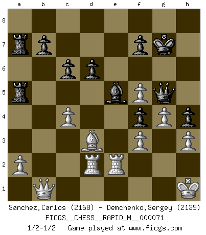 Last move : 1/2-1/2 2014 July 17 8:25:17 [Event "FICGS__CHESS__RAPID_M__000071"] [Site "FICGS"] [Date "2014.04.18"] [Round "1"] [White "Sanchez,Carlos"] [Black "Demchenko,Sergey"] [Result "1/2-1/2"] [WhiteElo "2168"] [BlackElo "2135"] 1.d4 Nf6 2.c4 g6 3.g3 Bg7 4.Bg2 O-O 5.Nc3 d6 6.Nf3 Nbd7 7.O-O e5 8.e4 c6 9.h3 Qb6 10.Re1 exd4 11.Nxd4 Re8 12.Re2 Qb4 13.Rc2 Nc5 14.Bd2 Qb6 15.Be3 Qc7 16.f3 a5 17.b3 Nfd7 18.Bf2 h5 19.Rb1 Ne5 20.Rd2 h4 21.g4 g5 22.Rc1 Ng6 23.Nce2 Be5 24.Be3 Qe7 25.Qc2 Qf6 26.Nf5 Na6 27.Qd1 Bxf5 28.exf5 Nf4 29.Nxf4 gxf4 30.Bf2 a4 31.bxa4 Nc5 32.Qc2 Nxa4 33.Kh1 Nc5 34.Rg1 Kf8 35.Bf1 Qg5 36.Qc1 Ra5 37.Qd1 Kg8 38.Re2 Rea8 39.Qb1 R8a6 40.Bxc5 Rxc5 41.Rd2 Ra7 42.Bd3 Rca5 43.R1g2 Kg7 44.Rge2 Bd4 45.Be4 Be5 46.Bd3 Bd4 47.Re4 Be5 48.R4e2 1/2-1/2 King's Indian : 3.g3 Kingside Castling by player Black (move 4) Kingside Castling by player White (move 7) This chess game ended in a draw. Follow this game move after move (download)I love all positions. Give me a difficult positional game, I will play it. But totally won positions, I cannot stand them. (Hein Donner) Der Umstand, daß uns eine 7 Stunden Zeitkontrolle ermöglicht eine großartige, tiefe Partie zu spielen, ist für die Massenmedien nicht weiter von Bedeutung. (Alexej Shirov) Tu eres para mi la Reina en d8 y yo soy el Peón en d7!!. (GM Eduard Gufeld) D'abord les bases : Jouez et étudiez, puis étudiez et jouez, ensuite jouez et étudiez, puis étudiez et jouez. Deuxièmement : Donnez toujours le meilleur de vous-même ! (Ken Smith) A computer lets you make more mistakes faster than any invention in human history - with the possible exceptions of handguns and tequila. (Mitch Ratcliffe)