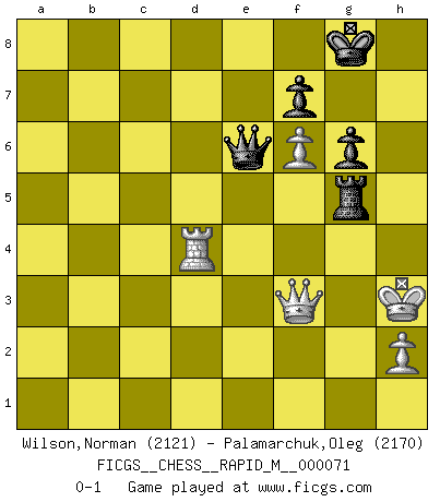 Last move : 0-1 2014 October 18 8:49:22 [Event "FICGS__CHESS__RAPID_M__000071"] [Site "FICGS"] [Date "2014.04.18"] [Round "1"] [White "Wilson,Norman"] [Black "Palamarchuk,Oleg"] [Result "0-1"] [WhiteElo "2121"] [BlackElo "2170"] 1.e4 c5 2.Nc3 d6 3.Bc4 Nf6 4.Nf3 e6 5.d4 cxd4 6.Nxd4 a6 7.O-O b5 8.Bb3 Be7 9.Qf3 Qc7 10.Qg3 O-O 11.Bh6 Ne8 12.Be3 Bb7 13.f3 Nd7 14.a3 Bf6 15.Rad1 Rb8 16.Qe1 h6 17.Qg3 Kh8 18.Nce2 Nc5 19.Ba2 Na4 20.b3 Nc3 21.Nxc3 Qxc3 22.Qe1 Qb2 23.Bb1 Qxa3 24.b4 a5 25.c3 Bxd4 26.Bxd4 e5 27.Be3 Bc8 28.Bc2 axb4 29.cxb4 Bd7 30.f4 Rc8 31.Bb1 Be6 32.f5 Bc4 33.Rf3 Qa4 34.Qd2 h5 35.Re1 Nf6 36.Kh1 Kh7 37.Bg5 Ne8 38.Rh3 Rh8 39.R1e3 Ra8 40.Re1 Kg8 41.Bh4 Qa7 42.Rc3 Qd4 43.Qb2 Qb6 44.Qd2 Ra4 45.Bc2 Rxb4 46.Qc1 Bd5 47.Rc8 Bc6 48.Bd3 Bd7 49.Rd8 Qb7 50.Qd2 Rd4 51.Qe2 Kh7 52.Bf2 Qc7 53.Rxd7 Qxd7 54.Bxd4 exd4 55.Bxb5 Qe7 56.Qxh5+ Kg8 57.Qe2 Qe5 58.g3 Qxg3 59.Ra1 Qe5 60.Ra8 d3 61.Bxd3 Rh4 62.Qf2 Rh6 63.Bb1 Kh7 64.Ra3 Nf6 65.Qg3 Qb2 66.Rb3 Qe2 67.Re3 Qd1+ 68.Qe1 Qd4 69.Qc3 Qb6 70.Qb3 Qc6 71.Qc3 Qb5 72.Bd3 Qb6 73.Re2 Rh4 74.Bc2 Qa6 75.Qe1 Rh3 76.Rg2 Qc6 77.Qg1 Kh8 78.Qd4 Rc3 79.Qa4 Qc8 80.Qa2 Kg8 81.Qa4 Kh7 82.Qa2 Qc7 83.Bb1 Qb7 84.Rg1 Nxe4 85.Bxe4 Qxe4+ 86.Qg2 Qe5 87.Rf1 d5 88.Qg4 Kg8 89.f6 g6 90.Qf4 Qe2 91.Kg1 Rc4 92.Qf3 Rg4+ 93.Kh1 Qe6 94.Ra1 Rh4 95.Qf2 Re4 96.Qf3 d4 97.Rd1 Qd5 98.Rd3 Re1+ 99.Kg2 Qa2+ 100.Kg3 Rg1+ 101.Kh3 Qe6+ 102.Kh4 Qe1+ 103.Kh3 Rg5 104.Rxd4 Qe6+ 0-1 Sicilian : Closed Kingside Castling by player White (move 7) Kingside Castling by player Black (move 10) 10 pieces endgame at move 104 : White KQRPP , Black KQRPP WHITE : King + 1 Queen 1 Rook 2 Pawns BLACK : King + 1 Queen 1 Rook 2 Pawns Player Black won this chess game. Follow this game move after move (download)Some part of a mistake is always correct. (Savielly Tartakover) Schach ist Kampf, hauptsächlich jedoch gegen die eigenen Fehler. (Savielly Grigorievitsch Tartakower) Todos los jugadores de Ajedrez deberían tener un pasatiempo. (Savielly Tartakower) 'L'échange des dames est un coup dur pour les deux adversaires...' Un journaliste lors d'une partie du match Spassky-Fischer Depression is just anger without enthusiasm. (Unknown)