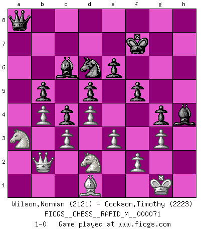 Last move : 1-0 2014 August 8 4:7:3 [Event "FICGS__CHESS__RAPID_M__000071"] [Site "FICGS"] [Date "2014.04.18"] [Round "1"] [White "Wilson,Norman"] [Black "Cookson,Timothy"] [Result "1-0"] [WhiteElo "2121"] [BlackElo "2223"] 1.d4 d5 2.c3 Nf6 3.Nf3 Bf5 4.Qb3 Qc8 5.Bg5 Nbd7 6.Nh4 Be6 7.Nd2 g6 8.Nhf3 c5 9.e3 c4 10.Qa3 h6 11.Bh4 b5 12.Be2 Bg7 13.O-O g5 14.Bg3 Nh5 15.Rfe1 Nxg3 16.hxg3 Qc6 17.b3 f5 18.Qb2 O-O 19.a4 a6 20.Reb1 Bf7 21.Ne1 g4 22.Nc2 Rfc8 23.Ra3 e6 24.Nb4 Qb7 25.Ra2 Bf8 26.Nc2 Qc6 27.axb5 axb5 28.Rba1 Rxa2 29.Rxa2 Nf6 30.Na3 Be8 31.Nab1 Ra8 32.Rxa8 Qxa8 33.b4 h5 34.Bd1 Kf7 35.Na3 Bc6 36.Nf1 Ne4 37.Nb1 Be7 38.Nfd2 Nd6 39.Na3 h4 40.gxh4 Bxh4 41.g3 1-0 This chess game has been lost on time (started : 2014.04.18 1:8:11) Queen's pawn game Kingside Castling by player White (move 13) Kingside Castling by player Black (move 18) Player White won this chess game. Follow this game move after move (download)By this measure (on the gap between Fischer & his contemporaries), I consider him the greatest world champion. (Garry Kasparov) Das Blackmar-Diemer-Gambit verändert den ganzen Menschen! (Emil Joseph Diemer) Observen a Garry Kasparov. Después de una derrota, invariablemente el gana la próxima partida. Prácticamente hace pedazos a su siguiente oponente. Eso es algo que tenemos que aprender a lograr. (Maurice Ashley) Les échecs sont un jeu par leur forme, un art par leur essence et une science par sa difficulté d'acquisition. Ils peuvent vous procurer autant de plaisir qu'un bon livre ou une belle musique, mais vous n'aurez une réelle joie que si vous arrivez à bien jouer. (Tigran Petrosian) Wikichess, chess moves explained by 'experimented' players. (Thibault de Vassal)