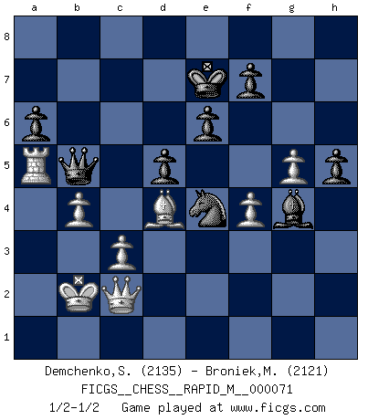 Last move : 1/2-1/2 2014 August 1 14:35:1 [Event "FICGS__CHESS__RAPID_M__000071"] [Site "FICGS"] [Date "2014.04.18"] [Round "1"] [White "Demchenko,Sergey"] [Black "Broniek,Mariusz Maciej"] [Result "1/2-1/2"] [WhiteElo "2135"] [BlackElo "2121"] 1.e4 c5 2.Nf3 d6 3.d4 cxd4 4.Nxd4 Nf6 5.Nc3 a6 6.Be3 e6 7.f3 b5 8.Qd2 Nbd7 9.O-O-O Bb7 10.g4 Nb6 11.a3 Rc8 12.Kb1 Nfd7 13.Rg1 h6 14.f4 Be7 15.h4 Nc4 16.Bxc4 Rxc4 17.g5 hxg5 18.hxg5 Nc5 19.b3 Rxc3 20.Qxc3 Nxe4 21.Qe1 g6 22.Kb2 Qc7 23.Ne2 Rh5 24.Rg4 Nc5 25.Rh4 Bf3 26.Rxh5 gxh5 27.Bd4 d5 28.Be5 Qb6 29.Ra1 Ne4 30.Nd4 Bg4 31.c3 Bc5 32.Qe3 Qb7 33.b4 Ba7 34.Qd3 Ke7 35.Qc2 Qc8 36.a4 Qc4 37.axb5 Bxd4 38.Bxd4 Qxb5 39.Ra5 1/2-1/2 Sicilian : Najdorf, Byrne (English) attack Queenside Castling by player White (move 9) This chess game ended in a draw. Follow this game move after move (download)If your opponent offers you a draw, try to work out why he thinks he's worse off. (Nigel Short) Ohne ihre Erfolge schmälern zu wollen würde ich sagen Petrosian, Spassky und Karpov verdanken ihre Siege ihren Trainern - Boleslavsky, Bondarevsky und Furman. (Mikhail Moiseyevich Botvinik) Solo el jugador con la iniciativa tiene el derecho a atacar. (Wilhelm Steinitz) La menace est plus forte que l'exécution. (Aaron Nimzovitch) Those parts of the system that you can hit with a hammer (not advised) are called hardware; those program instructions that you can only curse at are called software. (Anonymous)