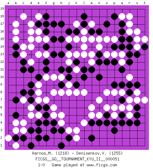 Last move : 1-0 2014 September 23 22:31:24 [Event "FICGS__GO__TOURNAMENT_KYU_II__000051"] [Site "FICGS"] [Date "2014.04.18"] [Round "1"] [Black "Aarnos,Mikko"] [White "Denisenkov,Valentin"] [Result "1-0"] [Rating 1 "1218"] [Rating 2 "1255"] 1.q16 c4 2.r4 d16 3.p3 r10 4.r12 r6 5.r8 q8 6.q7 r7 7.q9 p8 8.r9 p6 9.e4 h4 10.p9 o8 11.d8 d6 12.e6 e7 13.d7 e5 14.f6 d5 15.f5 f4 16.g4 f3 17.g3 g5 18.h3 h5 19.e3 f7 20.f2 g6 21.f4 g8 22.c11 c7 23.c8 l4 24.b7 c3 25.b5 b4 26.k16 f17 27.o12 r17 28.q17 r16 29.r15 s15 30.r14 s14 31.b2 d2 32.c2 a2 33.d3 b1 34.d1 b3 35.e2 j3 36.n10 l13 37.m16 p15 38.q15 n14 39.s13 q18 40.p18 r18 41.l10 l8 42.m14 m13 43.j14 l14 44.k12 m15 45.n16 p13 46.p12 o13 47.n12 n15 48.h17 c14 49.s5 q13 50.t14 s16 51.r13 o15 52.n13 l15 53.q5 q6 54.n4 m6 55.o17 t15 56.j2 k3 57.m2 k2 58.b13 c13 59.b14 b15 60.c12 p5 61.f12 f10 62.c15 d15 63.c16 b16 64.c17 b17 65.g17 c18 66.p4 f15 67.d13 d14 68.f18 e18 69.e17 d17 70.f16 e16 71.g15 e13 72.f14 e15 73.h11 f13 74.g13 j9 75.k9 k8 76.h9 h8 77.f17 r5 78.s4 s8 79.s9 t7 80.s6 s7 81.j10 j8 82.n6 n7 83.q4 q12 84.q11 m12 85.m11 l16 86.p14 m17 87.l17 k17 88.l18 k15 89.j16 j15 90.h15 j13 91.h13 j12 92.j11 k13 93.f11 k11 94.l11 g10 95.q14 h10 96.e10 e9 97.d9 e8 98.d11 d12 99.h1 n5 100.m4 m5 101.o5 o6 102.o4 1-0 Here are the names of the openings (joseki) played in the four corners : Corner d4 : c4 e4 Komoku (Somok, Xiao~mu`) 3-4 Point. The komoku (3-4) point is the traditional corner enclosure move.. Ikken Takagakari (Hankan Nop'dakeolch'im, Yi Gaogua`jiao~, 1-Space High Approach). The 5-4 approach move has become more popular in modern times, as modern Go emphasizes speed and influence. Corner d16 : d16 c11 Hoshi (Hwajeom, Seongjeom, Xingwei`) 4-4 Point. The star or hoshi (4-4) point, emphasizing influence at the potential expense of territory. Player Black won this Go (weiqi, baduk) game. Follow this game move after move (download)Empty triangles are bad. (Anonymous) Art disturbs, science reassures. (Georges Braque, Le Jour et la Nuit)