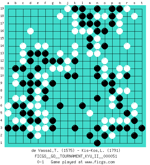 Last move : 0-1 2014 September 16 23:8:40 [Event "FICGS__GO__TOURNAMENT_KYU_II__000051 "] [Site "FICGS"] [Date "2014.04.18"] [Round "1"] [Black "de Vassal,Thibault "] [White "Kis-Kos,Laszlo "] [Result "0-1"] [Rating 1 "1575"] [Rating 2 "1791"] 1.c3 q16 2.r3 d16 3.k3 d6 4.r10 e3 5.d4 f5 6.e4 f4 7.g3 f3 8.c6 c7 9.b6 b7 10.d5 e6 11.g4 b4 12.b3 a6 13.c5 a5 14.d2 e2 15.o16 r14 16.c11 c13 17.e11 d3 18.k10 q4 19.q3 p4 20.p3 o4 21.n3 r8 22.q6 p7 23.r5 r4 24.q7 q8 25.p8 p6 26.s4 q10 27.p9 r11 28.p10 q11 29.h6 o3 30.o2 m5 31.n7 n2 32.m2 p2 33.n1 s3 34.s2 s5 35.t3 s6 36.l6 k16 37.o14 o12 38.m15 k14 39.l17 k17 40.l18 k18 41.k19 j19 42.l19 h18 43.k12 m13 44.p17 q17 45.f7 e8 46.f8 l16 47.m17 m16 48.n16 o18 49.p18 n18 50.n17 q18 51.q19 r19 52.p19 n14 53.m14 n13 54.n19 n15 55.m18 s18 56.n11 o11 57.n10 o10 58.o9 g11 59.f12 h13 60.g12 j11 61.h12 j12 62.j10 h11 63.g9 f10 64.d13 c12 65.d12 c14 66.d10 f14 67.f13 e14 68.e13 e10 69.c9 b10 70.b11 b9 71.d7 e7 72.d8 c4 73.a3 e5 74.e9 f9 75.d9 k13 0-1 Here are the names of the openings (joseki) played in the four corners : Corner d4 : c3 d6San-San (Sam-Sam, San-San) 3-3 Point. The San-San (3-3) point, emphasizing territory at the expense of influence.Niken Takagakari (Dukan Nop'dakeolch'im, E`r Gaogua`jiao~, 2-Space High Approach). Black may continue with 4-5 or 4-6. Black 4-6 works well when Black is in the lower right (so an extension in the middle works both ways). The more conservative 4-5 is makes a slightly tighter shape (better for a fight). Corner q16 : q16 o16Hoshi (Hwajeom, Seongjeom, Xingwei`) 4-4 Point. The star or hoshi (4-4) point, emphasizing influence at the potential expense of territory.Ikken Takagakari (Hankan Nop'dakeolch'im, Yi Gaojia, 1-Space High Approach). White typically responds at 6-4 or 3-10. White 4-10 is played when White finds play on the right side advantageous. White 4-8 or 3-8 may be played when White has support at top. Corner d16 : d16 c11Hoshi (Hwajeom, Seongjeom, Xingwei`) 4-4 Point. The star or hoshi (4-4) point, emphasizing influence at the potential expense of territory. Corner q4 : r3 q4San-San (Sam-Sam, San-San) 3-3 Point. The San-San (3-3) point, emphasizing territory at the expense of influence.Kata-tsuki (shoulder hit). The shoulder-hit is the traditional answer to the 3-3. The direction of Black 3 depends on the positions on the side. Crawling once may be the premise for a follow-up move of sliding with a knight's move in the opposite direction. If Black plays 3 at 3-4 (to the right), the follow-on knight's move is then played at the top (e.g. 3-4, 4-5, 5-2). Black's knight's move reduces territory potential on the side it is played. Player White won this Go (weiqi, baduk) game.Follow this game move after move (download ) In an unreasonable situation, an unreasonable move is reasonable. (Tamino) Coffee just isn't my cup of tea. (Unknown)