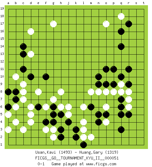 Last move : 0-1 2014 September 22 10:20:19 [Event "FICGS__GO__TOURNAMENT_KYU_II__000051"] [Site "FICGS"] [Date "2014.04.18"] [Round "1"] [Black "Usan,Kavi"] [White "Huang,Gary"] [Result "0-1"] [Rating 1 "1493"] [Rating 2 "1319"] 1.q16 d16 2.q3 d4 3.r9 o4 4.q5 l4 5.j4 g3 6.h3 j5 7.h5 j6 8.g4 f3 9.k3 o17 10.q14 q18 11.r17 r7 12.q7 r6 13.q6 r8 14.r5 q8 15.r11 q9 16.q10 p10 17.p11 o10 18.c6 b4 19.d10 g17 20.c14 c8 21.e6 e8 22.f10 b10 23.c11 b6 24.b7 c7 25.b5 d6 26.c5 d5 27.c4 c3 28.a6 a3 29.b8 c9 30.a8 a5 31.a4 d13 32.c13 a5 33.p9 p8 34.n5 b6 35.n4 o6 36.o5 l6 37.m6 l3 38.o9 o8 39.n9 n8 40.n10 m8 41.o11 g7 42.g6 h6 43.f4 l2 44.k2 g2 45.l1 m2 46.h2 f6 47.g5 h8 0-1 Here are the names of the openings (joseki) played in the four corners : Corner d4 : d4 j4 Hoshi (Hwajeom, Seongjeom, Xingwei`) 4-4 Point. The star or hoshi (4-4) point, emphasizing influence at the potential expense of territory. Corner q16 : q16 o17 Hoshi (Hwajeom, Seongjeom, Xingwei`) 4-4 Point. The star or hoshi (4-4) point, emphasizing influence at the potential expense of territory. Ikken Kakari (Hankan Keolch'im, Yi Gua`jiao~, 1-Space Low Approach). White 2 is the standard approach move to the 4-4. Player White won this Go (weiqi, baduk) game. Follow this game move after move (download)Grab the border points between two moyos. (Anonymous) Those who make the worst use of their time are the first to complain of its brevity. (Jean de la Bruyere)