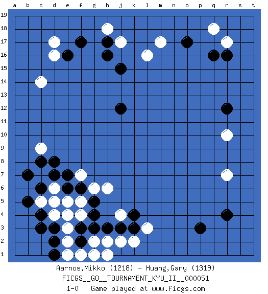 Last move : 1-0 2014 August 17 6:39:36 [Event "FICGS__GO__TOURNAMENT_KYU_II__000051"] [Site "FICGS"] [Date "2014.04.18"] [Round "1"] [Black "Aarnos,Mikko"] [White "Huang,Gary"] [Result "1-0"] [Rating 1 "1218"] [Rating 2 "1319"] 1.q16 d16 2.r4 d4 3.p3 r10 4.f17 j17 5.j15 m17 6.h17 h18 7.h16 c14 8.o17 l16 9.r12 r7 10.c6 c9 11.f6 d6 12.d7 c5 13.e6 d5 14.f3 c7 15.d8 f4 16.g4 e3 17.g3 f5 18.g5 g6 19.c8 h6 20.b7 j4 21.c3 e2 22.b5 h2 23.e16 d17 24.j12 r17 25.r16 q18 26.f2 f1 27.g1 e1 28.e4 e5 29.d3 g2 30.d2 h1 31.c4 e4 32.h3 f7 33.e7 j2 34.j3 k2 35.d1 g1 36.k3 l3 37.k4 1-0 Here are the names of the openings (joseki) played in the four corners : Corner d16 : d16 f17 Hoshi (Hwajeom, Seongjeom, Xingwei`) 4-4 Point. The star or hoshi (4-4) point, emphasizing influence at the potential expense of territory. Ikken Kakari (Hankan Keolch'im, Yi Gua`jiao~, 1-Space Low Approach). Black 2 is the standard approach move to the 4-4. Corner q16 : q16 m17 Hoshi (Hwajeom, Seongjeom, Xingwei`) 4-4 Point. The star or hoshi (4-4) point, emphasizing influence at the potential expense of territory. Corner d4 : d4 c6 Hoshi (Hwajeom, Seongjeom, Xingwei`) 4-4 Point. The star or hoshi (4-4) point, emphasizing influence at the potential expense of territory. Ikken Kakari (Hankan Keolch'im, Yi Gua`jiao~, 1-Space Low Approach). Black 2 is the standard approach move to the 4-4. Player Black won this Go (weiqi, baduk) game. Follow this game move after move (download)Everything would seem to be possible in Go. Like pulling a rabbit, by a magical move, out of a hat. (Pierre Audouard) When it is a question of money, everybody is of the same religion. (Voltaire)