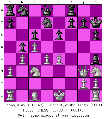 Last move : 0-1 2014 May 6 22:11:55 [Event "FICGS__CHESS__CLASS_F__000146"] [Site "FICGS"] [Date "2014.04.19"] [Round "1"] [White "Bromo,Alexis"] [Black "Rajput,Vishalsingh"] [Result "0-1"] [WhiteElo "1147"] [BlackElo "1031"] 1.d4 d5 2.c4 Bf5 3.Nc3 e6 4.a3 Nf6 5.f3 Be7 6.c5 O-O 7.b4 c6 8.e3 h6 9.Bd3 Bxd3 10.Qxd3 b5 11.e4 dxe4 12.fxe4 Nfd7 13.Qg3 Kh7 14.Nh3 Bh4 0-1 QGD : Grau (Sahovic) defense Kingside Castling by player Black (move 6) Player Black won this chess game. Follow this game move after move (download)Chess opens and enriches your mind. (Saudin Robovic) Ich verstehe Aljechins Kombinationen ganz gut; aber woher er diese Angriffschancen bekommt und wie er die Eröffnung behandelt das ist für mich ein Buch mit sieben Siegeln. (Rudolf Spielmann) Yo considero que Fischer es uno de los expertos mas grandes de aperturas de siempre. (Keith Hayward) Les écrivains ont utilisé les échecs pour analyser les côtés extrêmes de la nature humaine. Dans ce cadre, les échecs offrent un champ d'expérimentation idéal. Mais on pourrait faire la même chose avec la peinture. Et là, en vous référant à Van Gogh, vous ne tirerez pas de conclusion définitive sur les peintres. (Gary Kasparov) Your best chance to get a Royal Flush in a casino is in the bathroom. (Anonymous)