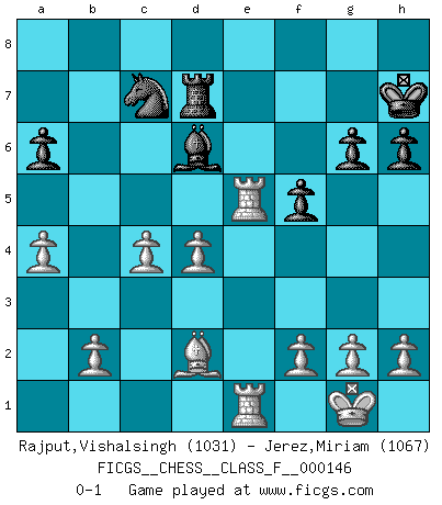 Last move : 0-1 2014 October 4 9:17:5 [Event "FICGS__CHESS__CLASS_F__000146"] [Site "FICGS"] [Date "2014.04.19"] [Round "1"] [White "Rajput,Vishalsingh"] [Black "Jerez,Miriam"] [Result "0-1"] [WhiteElo "1031"] [BlackElo "1067"] 1.e4 e5 2.Nf3 Nc6 3.Bc4 Nf6 4.Nc3 Bc5 5.O-O O-O 6.Re1 a6 7.a4 d5 8.exd5 Nd4 9.Nxe5 c6 10.dxc6 Be6 11.Bxe6 Nxe6 12.cxb7 Rb8 13.Nc6 Qc7 14.Nxb8 Rxb8 15.Qf3 Rxb7 16.Ne4 Nxe4 17.Rxe4 h6 18.c3 Ng5 19.Re8+ Bf8 20.Qg4 Qd7 21.Qxd7 Rxd7 22.d4 Ne6 23.Be3 Nc7 24.Re4 f5 25.Re5 g6 26.Re1 Kh7 27.c4 Bd6 28.Bf4 Bb4 29.Bd2 Bd6 0-1 Two knights defense Kingside Castling by player White (move 5) Kingside Castling by player Black (move 5) Player Black won this chess game. Follow this game move after move (download)Good offense and good defense both begin with good development. (Bruce A. Moon) Du weisst es gibt ein Problem mit Computern und Fernschach, wenn jeder eine Rating von 2450 hat. (John Christen Knudsen) Diferente gente reacciona diferentemente en aceptar la derrota. (Bobby Fischer) Assurément je connaissais par expérience le mystérieux attrait de ce jeu royal, le seul entre tous les jeux inventés par les hommes qui échappe souverainement à la tyrannie du hasard, le seul où l'on ne doive sa victoire qu'à son intelligence ou plutôt à une certaine forme d'intelligence. Mais n'est-ce pas déjà le limiter injurieusement que d'appeler les échecs un jeu ? N'est-ce pas une science, un art ou quelque chose qui, comme le cercueil de Mahomet entre ciel et terre, est suspendu entre l'un et l'autre, et qui réunit un nombre incroyable de contraires ? [...] C'est une pensée qui ne mène à rien, une mathématique qui n'établit rien, un art qui ne laisse pas d'uvre, une architecture sans matière; et il l'a prouvé néanmoins qu'il était plus durable, à sa manière, que les livres ou que tout autre monument, ce jeu unique qui appartient à tous les peuples et à tous les temps, et dont personne ne sait quel dieu en fit don à la terre pour tuer l'ennui, pour aiguiser l'esprit et stimuler l'âme. Où commence-t-il, où finit-il ? (Stefan Zweig) Nowadays, anyone who cannot speak English and is incapable of using the Internet is regarded as backward. (Al-Waleed bin Talal)