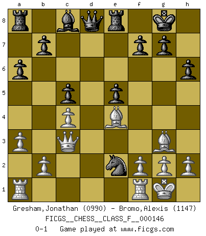Last move : 0-1 2014 May 21 20:54:38 [Event "FICGS__CHESS__CLASS_F__000146"] [Site "FICGS"] [Date "2014.04.19"] [Round "1"] [White "Gresham,Jonathan"] [Black "Bromo,Alexis"] [Result "0-1"] [WhiteElo "0990"] [BlackElo "1147"] 1.d4 d5 2.c4 e6 3.e3 Nc6 4.Nc3 a6 5.Nf3 h6 6.Bd3 Nf6 7.Qc2 Bb4 8.a3 Bxc3+ 9.Qxc3 O-O 10.Nd2 Re8 11.e4 dxe4 12.Nxe4 Nxe4 13.Bxe4 Nxd4 14.Bf4 e5 15.Bg3 c5 16.O-O Ne2+ 0-1 Queen's gambit declined Kingside Castling by player Black (move 9) Kingside Castling by player White (move 16) Player Black won this chess game. Follow this game move after move (download)There is only one thing Fischer does in Chess without pleasure: to lose ! (Boris Spassky) Der Partner hat auch seine Existenzberechtigung. (Savielly Grigorievitsch Tartakower) El Ajedrez expande y enriquece tu mente. (Saudin Robovic) Lorsque vous vous retrouvez devant une position atroce, ne tendez pas un ultime piège dérisoire avec l'intention d'abandonner si l'adversaire le déjoue ! Faites-vous plutôt un devoir de résister comme si votre vie en dépendait. Jouez le coup qui vous déplairait au centuple si vous étiez dans la peau de votre tortionnaire ! You must have a dream in order to have it come true. (A.P.J. Kalam)