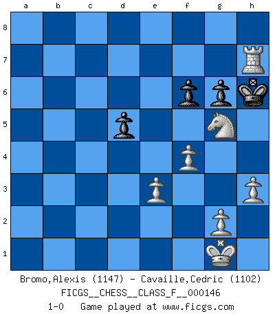 Last move : 1-0 2014 May 8 22:28:21 [Event "FICGS__CHESS__CLASS_F__000146"] [Site "FICGS"] [Date "2014.04.19"] [Round "1"] [White "Bromo,Alexis"] [Black "Cavaille,Cedric"] [Result "1-0"] [WhiteElo "1147"] [BlackElo "1102"] 1.d4 d5 2.c4 dxc4 3.Nc3 e6 4.a3 Nf6 5.e3 Be7 6.Bxc4 a6 7.Nf3 O-O 8.b4 b5 9.Bb3 c6 10.h3 a5 11.Bb2 axb4 12.axb4 Rxa1 13.Bxa1 Bxb4 14.O-O Bxc3 15.Bxc3 Ne4 16.Bb4 Re8 17.Ne5 Qb6 18.Bc5 Nxc5 19.dxc5 Qxc5 20.Nf3 Rd8 21.Qxd8+ Qf8 22.Rd1 g6 23.Qxf8+ Kxf8 24.Rd8+ Ke7 25.Rxc8 Nd7 26.Rxc6 Nf6 27.Nd4 Nd5 28.Bxd5 exd5 29.Nxb5 f6 30.Rc7+ Ke6 31.Rxh7 Ke5 32.Re7+ Kf5 33.Nd6+ Kg5 34.f4+ Kh6 35.Nf7+ Kg7 36.Ng5 Kh6 37.Rh7+ 1-0 Queen's gambit accepted Kingside Castling by player Black (move 7) Kingside Castling by player White (move 14) Player White won this chess game. Follow this game move after move (download)One of these modest little moves may be more embarrassing to your opponent than the biggest threat. (Siegbert Tarrasch) Der 70jährige Viktor Kortschnoi: Die Rentenanstalt wollte mich zwingen in Rente zu gehen. Meine Frau erhält jetzt eine Pension- und ich zahle weiter in die Rentenkasse ein! (Viktor Kortschnoi) No volvere nunca a jugar contigo. Has insultado a mi amigo. - cuando un oponente se maldijo por una mala jugada (Miguel Najdorf) Toute estimation doit être constamment réévaluée. (Jacob Estrin) Drag your thoughts away from your troubles... by the ears, by the heels, or any other way you can manage it. (Mark Twain)