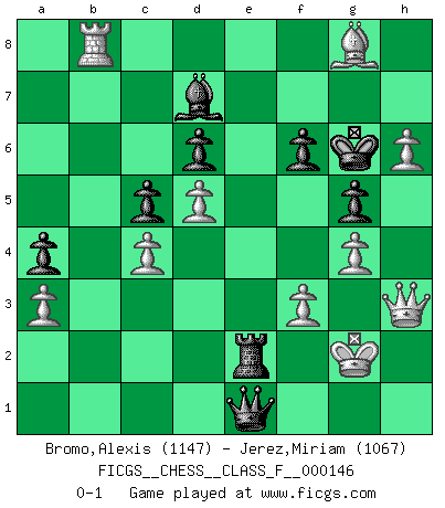 Last move : 0-1 2014 September 2 5:50:32 [Event "FICGS__CHESS__CLASS_F__000146"] [Site "FICGS"] [Date "2014.04.19"] [Round "1"] [White "Bromo,Alexis"] [Black "Jerez,Miriam"] [Result "0-1"] [WhiteElo "1147"] [BlackElo "1067"] 1.d4 Nf6 2.c4 Nc6 3.Nf3 d6 4.h3 e5 5.d5 e4 6.Nd4 Nxd4 7.Qxd4 g6 8.Bg5 Bg7 9.Bxf6 Bxf6 10.Qxe4+ Be7 11.Nc3 O-O 12.e3 b6 13.Be2 Bb7 14.O-O Re8 15.Qf3 f6 16.e4 a5 17.Bd3 c5 18.Rfe1 Rf8 19.Ne2 Bc8 20.Ng3 a4 21.a3 Bd7 22.Bc2 Rb8 23.h4 Kh8 24.h5 g5 25.Nf5 Rg8 26.Nh6 Rf8 27.Nf5 Be8 28.g4 b5 29.Bd3 b4 30.Kg2 bxa3 31.bxa3 Rb2 32.Reb1 Rxb1 33.Rxb1 Qa5 34.Nxe7 Rf7 35.h6 Qc3 36.Rb8 Rxe7 37.e5 Qxe5 38.Bf5 Kg8 39.Be6+ Kf8 40.Bf5 Kf7 41.Bxh7 Bd7 42.Bg8+ Kg6 43.Qh3 Qe4+ 44.f3 Qe2+ 45.Kg3 Qe1+ 46.Kg2 Qe2+ 47.Kg3 Qe1+ 48.Kg2 Re2+ 0-1 Kevitz-Trajkovich defense Kingside Castling by player Black (move 11) Kingside Castling by player White (move 14) Player Black won this chess game. Follow this game move after move (download)The boy (then a 12 year old boy named Anatoly Karpov) doesn't have a clue about Chess, and there's no future at all for him in this profession. (Mikhail Botvinnik) Wenn ein Kopf und ein Buch zusammenstoßen und es klingt hohl, ist es denn allemal im Buche? (Georg Christoph Lichtenberg) Prefiero perder una partida realmente buena, que ganar una mala. (David Levy) Votre prénom est 'Tactique', votre deuxième prénom est 'Tactique' et votre nom est 'Tactique'. (Ken Smith) Art is the only way to run away without leaving home. (Twyla Tharp)