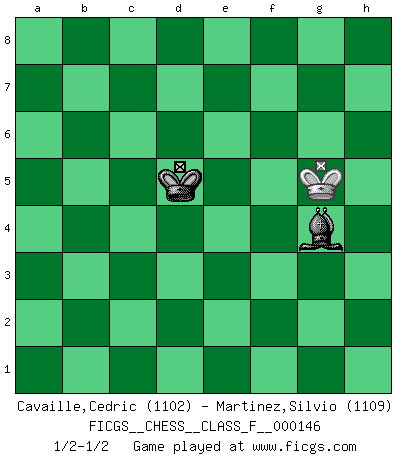 Last move : 1/2-1/2 2014 September 4 16:34:31 [Event "FICGS__CHESS__CLASS_F__000146"] [Site "FICGS"] [Date "2014.04.19"] [Round "1"] [White "Cavaille,Cedric"] [Black "Martinez,Silvio"] [Result "1/2-1/2"] [WhiteElo "1102"] [BlackElo "1109"] 1.e4 Nc6 2.Nf3 f6 3.Bb5 e5 4.Bxc6 dxc6 5.d4 exd4 6.Qxd4 Qxd4 7.Nxd4 c5 8.Nf3 b6 9.O-O Ne7 10.Nc3 Bb7 11.Rd1 g5 12.h3 Rd8 13.Rxd8+ Kxd8 14.Be3 h5 15.b3 a5 16.Rd1+ Kc8 17.Nd5 Nxd5 18.exd5 Rg8 19.c4 Be7 20.Nh2 f5 21.g3 f4 22.Bc1 fxg3 23.fxg3 Kb8 24.Kg2 Bc8 25.Re1 Bf6 26.Nf3 g4 27.hxg4 hxg4 28.Nh4 Kb7 29.Rf1 Bd4 30.Nf5 Rh8 31.Ne3 Rh3 32.Rh1 Rh8 33.Rxh8 Bxh8 34.Nf5 Bxf5 35.Kf2 Kc8 36.Bg5 Kd7 37.Ke3 Kd6 38.Kf4 Bd7 39.Ke3 Ke5 40.Bf4+ Kf5 41.Bxc7 Bd4+ 42.Ke2 b5 43.Bxa5 bxc4 44.bxc4 Ke4 45.Bb6 Bg1 46.a3 Be8 47.Ba7 Kd4 48.Kf1 Be3 49.Ke2 Ba4 50.Bxc5+ Kxc5 51.Kxe3 Bb3 52.Kf4 Bd1 53.a4 Bxa4 54.Kxg4 Kxc4 55.Kf5 Kxd5 56.g4 Bd7+ 57.Kg5 Bxg4 1/2-1/2 KP : Nimzovich defense Kingside Castling by player White (move 9) 10 pieces endgame at move 50 : White KBPPPP , Black KBBP WHITE : King + 1 Bishop 4 Pawns BLACK : King + 2 Bishops 1 Pawn 9 pieces endgame at move 50 : White KPPPP , Black KBBP WHITE : King + 4 Pawns BLACK : King + 2 Bishops 1 Pawn 8 pieces endgame at move 51 : White KPPPP , Black KBP WHITE : King + 4 Pawns BLACK : King + 1 Bishop 1 Pawn 7 pieces endgame at move 53 : White KPPP , Black KBP WHITE : King + 3 Pawns BLACK : King + 1 Bishop 1 Pawn 6 pieces endgame at move 54 : White KPPP , Black KB WHITE : King + 3 Pawns BLACK : King + 1 Bishop 5 pieces endgame at move 54 : White KPP , Black KB WHITE : King + 2 Pawns BLACK : King + 1 Bishop 4 pieces endgame at move 55 : White KP , Black KB WHITE : King + 1 Pawn BLACK : King + 1 Bishop 3 pieces endgame at move 57 : White K , Black KB WHITE : King + BLACK : King + 1 Bishop This chess game ended in a draw. Follow this game move after move (download)Openings teach you openings. Endgames teach you chess ! (Stephan Gerzadowicz) Schach ist die gewalttätigste aller Sportarten. (Garry Kasparov) El Ajedrez moderno está demasiado preocupado con cosas como la estructura de Peones. Olvidenlo, el Jaque Mate termina la partida. (Nigel Short) Karpov est une pièce de musée. (Garry Kasparov) I feel so... helpless. (C-3PO in Star Wars ep.3)