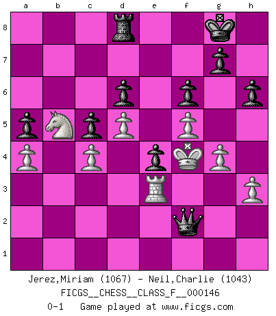 Last move : 0-1 2014 August 9 4:5:2 [Event "FICGS__CHESS__CLASS_F__000146"] [Site "FICGS"] [Date "2014.04.19"] [Round "1"] [White "Jerez,Miriam"] [Black "Neil,Charlie"] [Result "0-1"] [WhiteElo "1067"] [BlackElo "1043"] 1.e4 e5 2.Nf3 Nc6 3.Bb5 a6 4.Ba4 Nf6 5.Nc3 d6 6.O-O b5 7.Bb3 Be7 8.h3 Bb7 9.Re1 O-O 10.d4 Re8 11.d5 Na5 12.Be3 Nxb3 13.axb3 c5 14.g4 Rc8 15.Na2 Nxe4 16.c4 Ng5 17.Kh2 bxc4 18.bxc4 h6 19.Nxg5 Bxg5 20.Bxg5 Qxg5 21.f3 a5 22.Re4 Ba6 23.b3 Rb8 24.Rb1 Bc8 25.f4 Qe7 26.Qe2 Rb7 27.Re1 f6 28.f5 Bd7 29.Rb1 Reb8 30.Re3 Ba4 31.bxa4 Rxb1 32.Nc3 R1b2 33.Nb5 Rxe2+ 34.Rxe2 e4 35.Kg2 Qe5 36.Re3 Qb2+ 37.Kg3 Rd8 38.Kf4 Qf2+ 0-1 Ruy Lopez : Four knights (Tarrasch) variation Kingside Castling by player White (move 6) Kingside Castling by player Black (move 9) Player Black won this chess game. Follow this game move after move (download)There must have been a time when men were demigods, or they could not have invented Chess. (Gustav Schenk) Habe Mut, dich deines eigenen Verstandes zu bedienen. (Immanuel Kant) Buenas posiciones no logran ganar juegos, buenas movidas sí. (Gerald Abrahams) Que feriez-vous si vous étiez en train de jouer aux échecs et que la fin du monde arrive ? Je continuerais à jouer. (Saint Borromée) He who laughs last probably does not get the joke. (Unknown)
