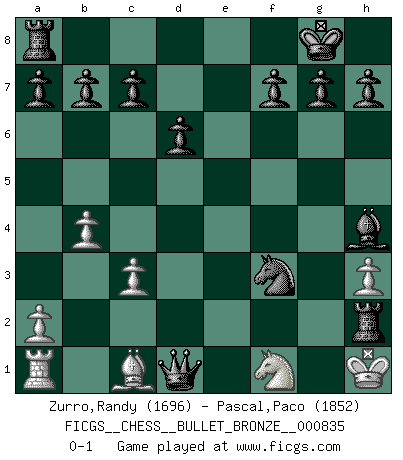 Last move : 0-1 2014 April 23 8:17:31 [Event "FICGS__CHESS__BULLET_BRONZE__000835"] [Site "FICGS"] [Date "2014.04.23"] [Round "1"] [White "Zurro,Randy"] [Black "Pascal,Paco"] [Result "0-1"] [WhiteElo "1696"] [BlackElo "1852"] 1.e4 e5 2.Nf3 Nc6 3.c3 Bc5 4.Qe2 Nf6 5.Nh4 d6 6.f4 Ng4 7.fxe5 Bf2+ 8.Kd1 Bxh4 9.Qxg4 Bxg4+ 10.Be2 Nxe5 11.Rf1 Qg5 12.Kc2 Bxe2 13.Rh1 Qxg2 14.Rd1 Qxe4+ 15.d3 Bxd3+ 16.Rxd3 Nxd3 17.Nd2 Ne1+ 18.Kd1 Qc2+ 19.Ke2 O-O 20.b4 Rfe8+ 21.Kf1 Qd3+ 22.Kg1 Re2 23.Nf1 Nf3+ 24.Kh1 Qd1 25.h3 Rh2+ 0-1 This chess game has been lost on time (started : 2014.04.23 3:17:39) Ponziani Opening Kingside Castling by player Black (move 19) Player Black won this chess game. Follow this game move after move (download)When you don't know what to play, wait for an idea to come into your opponent's mind. You may be sure that idea will be wrong. (Siegbert Tarrasch) Ich weiss nicht was Gott gegen mich auf 1.e4 antworten würde. (Robert James Fischer) Aunque la mayoría de la gente disfruta observar las partidas de los grandes Maestros de ataque, algunos de los jugadores mas notables en la historia han sido los jugadores silenciosos posicionales. Lentamente ellos te aplastan despojandote de tu espacio, congestionando tus piezas y dejandote virtualmente sin nada que hacer. (Yasser Seirawan) La vie et les Echecs sont tous les deux une lutte constante. (Lasker) Men should grow up. - Yeah. And dogs should stop licking themselves. It's not gonna happen. (Gregory House to Dr. Cameron, House M.D.)