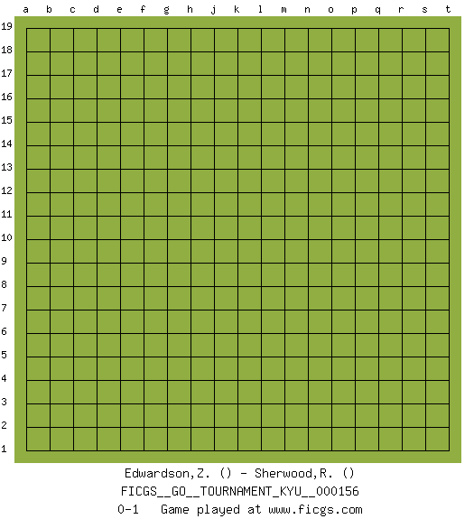 Last move : 0-1 2014 May 23 21:46:12 [Event "FICGS__GO__TOURNAMENT_KYU__000156"] [Site "FICGS"] [Date "2014.04.23"] [Round "1"] [Black "Edwardson,Zachariah"] [White "Sherwood,Russell"] [Result "0-1"] 0-1 This go game has been lost on time (started : 2014.04.23 15:19:45) Here are the names of the openings (joseki) played in the four corners : Player White won this Go (weiqi, baduk) game. Follow this game move after move (download)You can hide nothing on the goban. (Pierre Audouard) Treat your password like your toothbrush. Don't let anybody else use it, and get a new one every six months. (Clifford Stoll)