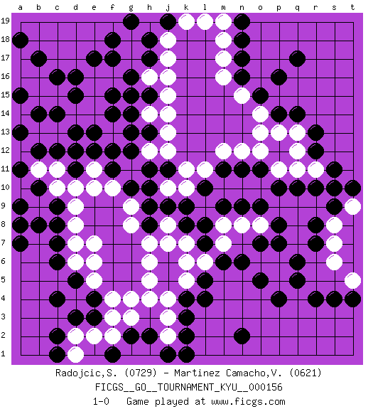 Last move : 1-0 2014 August 9 19:53:21 [Event "FICGS__GO__TOURNAMENT_KYU__000156"] [Site "FICGS"] [Date "2014.04.23"] [Round "1"] [Black "Radojcic,Sasa"] [White "Martinez Camacho,Victor Hugo"] [Result "1-0"] [Rating 1 "0729"] [Rating 2 "0621"] 1.c4 d6 2.d5 e5 3.e4 f4 4.e3 e6 5.c6 d8 6.c16 c10 7.c12 d12 8.d13 c11 9.b12 d14 10.e13 c13 11.c14 b13 12.b14 c15 13.d15 b15 14.a13 b16 15.d16 e14 16.b17 a17 17.a15 a16 18.a18 f13 19.f14 e15 20.f15 e16 21.e17 f16 22.g16 g17 23.f17 h16 24.h15 j16 25.f12 g13 26.d11 e11 27.e12 e10 28.g12 h12 29.h13 h14 30.g14 j14 31.q17 j15 32.g15 j13 33.g13 g11 34.f11 f10 35.h11 j12 36.g10 g9 37.h9 g8 38.q14 k10 39.r4 h6 40.h8 h7 41.k8 k7 42.l8 j8 43.j9 j7 44.k9 h4 45.k4 k5 46.l4 j4 47.l5 l6 48.m6 j3 49.k3 m7 50.l7 k6 51.n6 m8 52.m9 n8 53.l10 k11 54.n9 o8 55.o9 l11 56.m11 m12 57.n11 n12 58.o11 p9 59.p10 p11 60.p8 q8 61.p7 q9 62.q10 q11 63.r10 o6 64.o7 g4 65.o5 p6 66.q6 p5 67.p4 q7 68.q5 r9 69.s10 o12 70.k2 j2 71.j1 h1 72.k1 f3 73.h2 g1 74.g2 f2 75.f1 e2 76.d3 d2 77.c2 d1 78.c1 d7 79.n16 q13 80.p14 q12 81.s9 s8 82.r7 s7 83.r8 o14 84.o15 o13 85.r13 p13 86.h17 g18 87.h18 n15 88.p16 m16 89.n17 m17 90.n18 j18 91.f18 h19 92.g19 d9 93.j19 j17 94.c7 d10 95.d12 b11 96.c8 b9 97.b8 a8 98.a7 a10 99.j11 j10 100.h10 m18 101.n19 m19 102.r12 r11 103.s11 a12 104.a9 k19 105.a8 l19 106.a11 h5 107.b10 t9 108.t10 s6 109.s4 t5 110.t4 g3 111.n2 e7 112.c9 1-0 Here are the names of the openings (joseki) played in the four corners : Corner d4 : c4 d6 Komoku (Somok, Xiao~mu`) 3-4 Point. The komoku (3-4) point is the traditional corner enclosure move.. Player Black won this Go (weiqi, baduk) game. Follow this game move after move (download)Good moves and bad moves are bedfellows. (Anonymous) Don't be discouraged. It's often the last key in the bunch that opens the lock. (Author unknown)