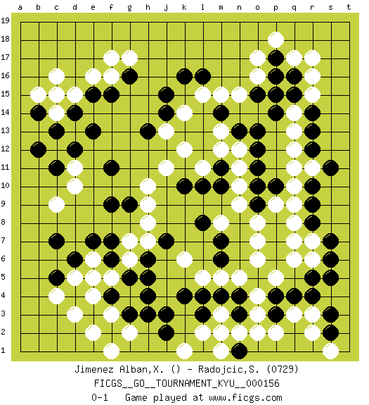 Last move : 0-1 2014 September 1 4:1:7 [Event "FICGS__GO__TOURNAMENT_KYU__000156"] [Site "FICGS"] [Date "2014.04.23"] [Round "1"] [Black "Jimenez Alban,Xavier Miguel"] [White "Radojcic,Sasa"] [Result "0-1"] [Rating 2 "0729"] 1.q16 c16 2.q4 d3 3.r10 o17 4.p17 r17 5.k16 p18 6.f2 e2 7.j3 r16 8.q15 r15 9.b14 f16 10.g16 f17 11.c7 c9 12.c11 d10 13.c5 c4 14.k10 r6 15.r5 q6 16.n4 q3 17.p3 r3 18.r4 p2 19.s6 o2 20.n3 n2 21.m2 m1 22.l1 l2 23.n1 m3 24.l3 m1 25.m4 m2 26.f4 k1 27.j2 o3 28.p4 o4 29.o5 n5 30.p6 q8 31.p10 p9 32.r8 r7 33.s7 o6 34.s5 p5 35.p7 q7 36.p8 q9 37.o9 o8 38.s3 r2 39.s2 s1 40.m7 o7 41.m6 q10 42.o11 d5 43.d6 e5 44.f6 f5 45.g5 e6 46.e7 g6 47.f7 g4 48.h5 f3 49.g3 e4 50.h4 g2 51.h3 h7 52.j7 h8 53.f9 h10 54.f11 j11 55.h13 k12 56.m14 m12 57.m11 l11 58.l10 n12 59.o13 n11 60.m10 n9 61.o10 n10 62.o12 m8 63.l8 m5 64.l4 l5 65.k4 k6 66.h6 g7 67.g9 h9 68.e15 e16 69.f15 g17 70.f4 f1 71.r9 d11 72.d12 d15 73.d14 c14 74.c13 c15 75.e13 b15 76.b12 j13 77.j14 k14 78.j15 l15 79.l16 m15 80.o15 q11 81.r12 q12 82.r13 q13 83.r14 r11 84.s11 q14 85.p14 q17 86.p16 o16 87.p15 n15 88.n13 m13 0-1 Here are the names of the openings (joseki) played in the four corners : Corner q16 : q16 o17 Hoshi (Hwajeom, Seongjeom, Xingwei`) 4-4 Point. The star or hoshi (4-4) point, emphasizing influence at the potential expense of territory. Ikken Kakari (Hankan Keolch'im, Yi Gua`jiao~, 1-Space Low Approach). White 2 is the standard approach move to the 4-4. Corner d4 : d3 f2 Komoku (Somok, Xiao~mu`) 3-4 Point. The komoku (3-4) point is the traditional corner enclosure move.. Corner d16 : c16 b14 Komoku (Somok, Xiao~mu`) 3-4 Point. The komoku (3-4) point is the traditional corner enclosure move.. Corner q4 : q4 r6 Hoshi (Hwajeom, Seongjeom, Xingwei`) 4-4 Point. The star or hoshi (4-4) point, emphasizing influence at the potential expense of territory. Ikken Kakari (Hankan Keolch'im, Yi Gua`jiao~, 1-Space Low Approach). White 2 is the standard approach move to the 4-4. Player White won this Go (weiqi, baduk) game. Follow this game move after move (download)Learning josekis by heart is useless if you don't try departing from them. (Pierre Audouard) It is a good thing for an uneducated man to read books of quotations. (Winston Churchill)