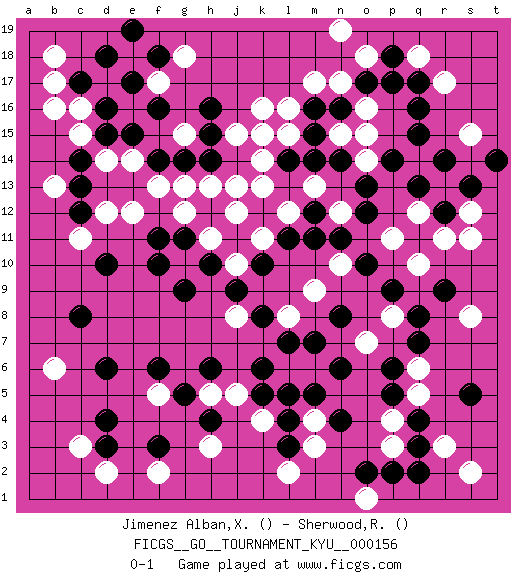 Last move : 0-1 2014 October 10 9:33:10 [Event "FICGS__GO__TOURNAMENT_KYU__000156"] [Site "FICGS"] [Date "2014.04.23"] [Round "1"] [Black "Jimenez Alban,Xavier Miguel"] [White "Sherwood,Russell"] [Result "0-1"] 1.q16 k16 2.d16 q10 3.o17 o18 4.q4 o16 5.d4 l16 6.d10 o15 7.q13 q12 8.p17 q18 9.q17 r17 10.p18 n17 11.h16 c16 12.c14 c15 13.d15 b16 14.c17 b17 15.d18 e18 16.e17 e16 17.f16 d14 18.e15 e14 19.f14 b18 20.q8 f13 21.g14 h13 22.h14 j13 23.k10 k4 24.n4 g13 25.o10 k14 26.h4 k15 27.k6 h3 28.l3 l2 29.l5 s2 30.o13 k13 31.g11 g10 32.g9 c3 33.d3 d2 34.f3 f2 35.f6 f5 36.d6 b6 37.c8 s8 38.s5 s11 39.s13 s15 40.q15 q14 41.p14 o14 42.r14 g15 43.m14 r3 44.q3 p3 45.q2 n12 46.m12 l12 47.m11 m9 48.n8 o7 49.n6 p8 50.q7 q6 51.p6 q5 52.p5 p4 53.o2 o1 54.p2 j15 55.h15 f17 56.f18 g18 57.e19 b13 58.c13 d12 59.c12 c11 60.m16 m17 61.n16 n15 62.m15 m13 63.n14 l6 64.l7 m6 65.m7 l8 66.k8 j8 67.h6 h5 68.g5 j5 69.k5 m3 70.l4 m4 71.m5 k11 72.l11 n10 73.n11 p11 74.o12 j12 75.p9 e12 76.f11 h11 77.h10 g12 78.f10 j10 79.j9 r11 80.r9 s12 81.t14 r13 82.r12 n19 83.l14 l15 0-1 This go game has been lost on time (started : 2014.04.23 15:19:45) Here are the names of the openings (joseki) played in the four corners : Player White won this Go (weiqi, baduk) game. Follow this game move after move (download)Don't disturb symmetry. (Anonymous) Humor is by far the most significant activity of the human brain. (Edward De Bono)