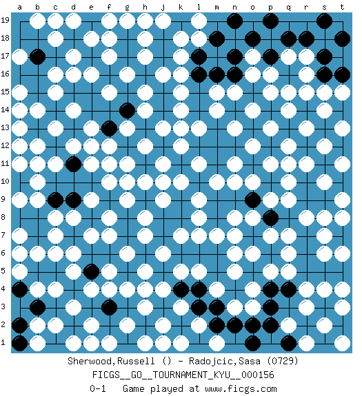 Last move : 0-1 2014 December 8 7:29:3 [Event "FICGS__GO__TOURNAMENT_KYU__000156"] [Site "FICGS"] [Date "2014.04.23"] [Round "1"] [Black "Sherwood,Russell"] [White "Radojcic,Sasa"] [Result "0-1"] [Rating 2 "0729"] 1.d4 d17 2.q4 r16 3.f14 d14 4.d10 d8 5.d9 c6 6.c5 d6 7.d7 e7 8.b5 b6 9.b7 c7 10.b8 a5 11.a2 d5 12.a1 e4 13.e3 c4 14.a3 d3 15.f3 b4 16.a4 c2 17.d2 e2 18.e1 d1 19.f2 f1 20.g1 e1 21.a6 a7 22.a8 a6 23.e5 f4 24.g5 g4 25.g3 h3 26.h4 g2 27.j3 h5 28.e8 c8 29.c9 b9 30.a10 b10 31.b11 a9 32.c10 a11 33.a12 b12 34.b13 c11 35.c12 a13 36.a14 a12 37.d11 b11 38.g7 c13 39.e15 b14 40.d13 d12 41.e12 e13 42.f13 e11 43.f11 f12 44.g12 e12 45.e10 f10 46.g10 e9 47.f9 g11 48.h11 f11 49.d15 f8 50.g8 g9 51.h9 h10 52.j10 g10 53.d18 e18 54.f19 c18 55.e17 e16 56.f16 f17 57.g17 f18 58.g18 d19 59.c19 b19 60.a19 h12 61.j13 g13 62.g14 j11 63.k11 j9 64.k9 h8 65.j7 g6 66.h6 f5 67.j5 j4 68.k4 h4 69.l4 h7 70.h2 h1 71.j1 j2 72.k2 k1 73.l1 j1 74.f3 k3 75.m2 j6 76.k6 k5 77.m5 k10 78.l10 j10 79.j8 k7 80.k8 l7 81.m8 m7 82.m6 n7 83.o7 n6 84.o5 n5 85.n4 o6 86.p6 p7 87.q8 o8 88.n9 n8 89.o9 l9 90.m9 l8 91.p8 q7 92.r7 q6 93.r6 q5 94.r5 p5 95.p4 o4 96.m3 o3 97.p2 l2 98.l3 m1 99.o2 n3 100.n2 l11 101.m12 m10 102.m11 n10 103.o11 o10 104.p10 p9 105.o9 q9 106.r10 r8 107.r9 q10 108.p8 s8 109.t8 s7 110.t7 s6 111.s5 t6 112.t5 t9 113.t16 r4 114.p3 m4 115.l6 l5 116.t10 s4 117.s3 r3 118.r2 s2 119.s1 t3 120.g15 q2 121.q1 r1 122.o1 t1 123.b17 c16 124.s9 t8 125.s11 r11 126.r12 q11 127.h16 k16 128.l16 k15 129.h19 d16 130.j17 k17 131.j18 k18 132.k19 l19 133.m18 l18 134.n17 o16 135.j15 k12 136.h14 k14 137.t12 s10 138.s13 s15 139.r14 r15 140.q13 q15 141.p12 p11 142.p14 p15 143.o13 n11 144.n14 m14 145.n12 m15 146.o15 n15 147.m13 l13 148.t14 t15 149.s17 o14 150.r18 n13 151.l12 o12 152.n19 o17 153.o18 p13 154.p19 q12 155.p17 q14 156.q16 r13 157.s16 r17 158.q18 q17 159.s19 s14 160.b18 c19 161.e19 g19 162.b16 f19 163.m16 c15 164.b15 a15 165.a16 a14 166.a18 p16 167.n16 s12 168.e14 t13 169.t18 t11 170.c3 b2 171.b3 f7 172.c1 b1 173.l17 j19 174.d9 h18 175.d11 h19 176.b3 h17 177.h13 j16 178.j14 g16 179.j12 h15 180.c17 f15 181.c9 k13 182.j12 a17 183.b17 t4 184.a4 pass 185.a2 pass 186.g14 j13 187.f13 pass 188.h13 h14 189.a1 pass 0-1 Here are the names of the openings (joseki) played in the four corners : Corner d16 : d17 f14 Komoku (Somok, Xiao~mu`) 3-4 Point. The komoku (3-4) point is the traditional corner enclosure move.. Corner d4 : d4 d8 Hoshi (Hwajeom, Seongjeom, Xingwei`) 4-4 Point. The star or hoshi (4-4) point, emphasizing influence at the potential expense of territory. Player White won this Go (weiqi, baduk) game. Follow this game move after move (download)For rectangular six in the corner, dame is necessary. (Anonymous) Animated gif is worth one mega-word. (Unknown)