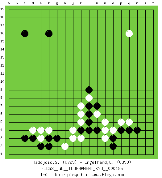 Last move : 1-0 2014 June 16 23:21:56 [Event "FICGS__GO__TOURNAMENT_KYU__000156"] [Site "FICGS"] [Date "2014.04.23"] [Round "1"] [Black "Radojcic,Sasa"] [White "Engelhard,Christof"] [Result "1-0"] [Rating 1 "0729"] [Rating 2 "0399"] 1.r4 d4 2.c16 q16 3.f16 q5 4.q4 p5 5.p4 o4 6.o3 n3 7.o2 n5 8.m4 n4 9.l4 k3 10.k4 j3 11.g3 j4 12.l6 k5 13.l5 k6 14.l7 k7 15.d3 f4 16.f3 e3 17.e2 e4 18.c3 h2 19.f2 m6 20.l9 l8 21.m7 1-0 This go game has been lost on time (started : 2014.04.23 15:19:45) Here are the names of the openings (joseki) played in the four corners : Corner q4 : r4 q5 Komoku (Somok, Xiao~mu`) 3-4 Point. The komoku (3-4) point is the traditional corner enclosure move.. Player Black won this Go (weiqi, baduk) game. Follow this game move after move (download)When you study joseki, you lose two stones in strength. (Anonymous) Bobby never cared about money, though. His only desire was to prove that his choices were correct: He wanted chess to be important because he was a chess player, and he wanted to be important. Bobby knew money was important, but he didn't have a clue why, outside of clothes and status. The only way he could accomplish what he wanted was to fight for a lot of money. Once he got it, he gave it away. He did not know how to spend it. And once he'd become champion, after, essentially, sacrificing his life for it, he didn't know how to spend his time. (Bob Wade)