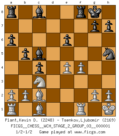 Last move : 1/2-1/2 2007 April 7 13:3:27 [Event "FICGS__CHESS__WCH_STAGE_2_GROUP_03__000001"] [Site "FICGS"] [Date "2007.02.15"] [Round "1"] [White "Plant,Kevin D."] [Black "Tsenkov,Ljubomir"] [Result "1/2-1/2"] [WhiteElo "2248"] [BlackElo "2169"] 1.d4 d5 2.c4 e6 3.Nf3 Nf6 4.Nc3 c6 5.e3 Nbd7 6.Bd3 dxc4 7.Bxc4 b5 8.Bd3 a6 9.e4 c5 10.d5 Qc7 11.dxe6 fxe6 12.O-O c4 13.Bc2 Bc5 14.Qe2 Ne5 15.Nxe5 Qxe5 16.Kh1 O-O 17.f4 Qh5 18.Qxh5 Nxh5 1/2-1/2 Queen's gambit declined Kingside Castling by player White (move 12) Kingside Castling by player Black (move 16) This chess game ended in a draw. Follow this game move after move (download)If your opponent cannot do anything active, then don't rush the position; instead you should let him sit there, suffer, and beg you for a draw. (Jeremy Silman) Ich bin der einzige Schachspieler, der sich während der Vorbereitungen zum Turnier verletzt hat. (Woody Allen) No hay un Gran Maestro de Ajedrez que sea normal; solo se diferencían ellos por la magnitud de su locura. (Viktor Korchnoi) Pour se monter efficace, un Cavalier a besoin d'avant-postes ! Les Cavaliers font les meilleurs bloqueurs de pions passés. True nature is revealed in times of difficulty. (Chinese proverb)