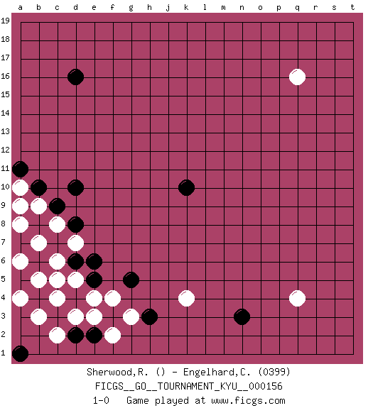 Last move : 1-0 2014 July 6 12:19:56 [Event "FICGS__GO__TOURNAMENT_KYU__000156"] [Site "FICGS"] [Date "2014.04.23"] [Round "1"] [Black "Sherwood,Russell"] [White "Engelhard,Christof"] [Result "1-0"] [Rating 2 "0399"] 1.d4 q4 2.d16 q16 3.k10 k4 4.d10 g3 5.n3 e3 6.c3 d3 7.f3 e4 8.e2 f2 9.d2 c4 10.b4 d5 11.d6 c2 12.a1 b3 13.e5 f4 14.g5 b5 15.b6 d7 16.e6 c6 17.c7 c5 18.a5 b7 19.b8 a6 20.a7 a8 21.a9 a4 22.h3 c8 23.d8 b9 24.b10 a10 25.a11 a9 26.c9 1-0 This go game has been lost on time (started : 2014.04.23 15:19:45) Here are the names of the openings (joseki) played in the four corners : Corner d4 : d4 g3 Hoshi (Hwajeom, Seongjeom, Xingwei`) 4-4 Point. The star or hoshi (4-4) point, emphasizing influence at the potential expense of territory. Niken Kakari (Dukan Keolch'im, E`r Gua`jiao~, 2-Space Low Approach). Black typically answers by 7-3 or 3-5 (which is not joseki). Corner q4 : q4 n3 Hoshi (Hwajeom, Seongjeom, Xingwei`) 4-4 Point. The star or hoshi (4-4) point, emphasizing influence at the potential expense of territory. Niken Kakari (Dukan Keolch'im, E`r Gua`jiao~, 2-Space Low Approach). White typically answers by 7-3 or 3-5 (which is not joseki). Player Black won this Go (weiqi, baduk) game. Follow this game move after move (download)Sacrifice for shape. (Anonymous) For a mechanic, you seem to do an excessive amount of thinking. (C-3PO in Star Wars ep.2)