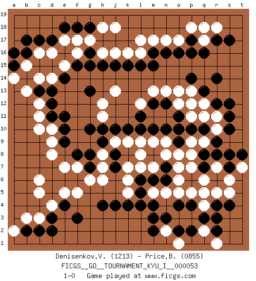 Last move : 1-0 2014 October 8 22:1:29 [Event "FICGS__GO__TOURNAMENT_KYU_I__000053"] [Site "FICGS"] [Date "2014.04.26"] [Round "1"] [Black "Denisenkov,Valentin"] [White "Price,Brennan"] [Result "1-0"] [Rating 1 "1213"] [Rating 2 "0855"] 1.q16 d4 2.q3 d16 3.r9 c10 4.k4 k16 5.f3 c6 6.d2 c3 7.c17 c16 8.d17 e17 9.e18 f17 10.f18 g17 11.b16 b15 12.b17 c14 13.k10 r5 14.r4 q5 15.o4 p3 16.p4 q4 17.r3 o3 18.n3 n2 19.m3 q2 20.r2 o1 21.m2 r1 22.p2 p5 23.o2 q9 24.q10 p9 25.p10 o17 26.r14 q18 27.r8 p7 28.n6 o6 29.n7 r7 30.q8 p8 31.q7 q6 32.s7 s6 33.s8 n8 34.n10 n9 35.m10 l8 36.j8 k7 37.j7 l9 38.l10 n5 39.m6 m5 40.l6 k5 41.l5 k6 42.h4 l7 43.j4 o7 44.m4 m7 45.l4 o5 46.o9 m9 47.o10 o8 48.e10 d9 49.e9 d8 50.d12 c12 51.d11 c11 52.d13 d14 53.g13 j13 54.m16 m17 55.n16 n17 56.o16 l17 57.p17 p18 58.c2 b3 59.h15 h16 60.j15 j16 61.k15 f5 62.r17 q17 63.p16 r18 64.s17 f7 65.g18 j18 66.f15 h12 67.g10 h6 68.b2 a2 69.c13 b13 70.e16 e15 71.g16 f16 72.g15 h18 73.e14 m13 74.l15 l16 75.m15 j9 76.j10 k9 77.h9 h11 78.h10 h8 79.g8 h7 80.g7 g6 81.f8 e7 82.s4 s5 83.e4 e5 84.d3 c5 85.a15 a14 86.a16 d10 87.e11 t7 88.t8 r10 89.s10 r11 90.s11 q12 91.s12 p13 92.r12 q11 93.q13 o12 94.p12 p11 95.o11 p12 96.p14 n13 97.n12 o13 98.m12 l12 99.l11 1-0 Here are the names of the openings (joseki) played in the four corners : Corner d4 : d4 f3 Hoshi (Hwajeom, Seongjeom, Xingwei`) 4-4 Point. The star or hoshi (4-4) point, emphasizing influence at the potential expense of territory. Ikken Kakari (Hankan Keolch'im, Yi Gua`jiao~, 1-Space Low Approach). Black 2 is the standard approach move to the 4-4. Corner d16 : d16 c17 Hoshi (Hwajeom, Seongjeom, Xingwei`) 4-4 Point. The star or hoshi (4-4) point, emphasizing influence at the potential expense of territory. Corner q16 : q16 o17 Hoshi (Hwajeom, Seongjeom, Xingwei`) 4-4 Point. The star or hoshi (4-4) point, emphasizing influence at the potential expense of territory. Ikken Kakari (Hankan Keolch'im, Yi Gua`jiao~, 1-Space Low Approach). White 2 is the standard approach move to the 4-4. Player Black won this Go (weiqi, baduk) game. Follow this game move after move (download)The carpenter's square becomes ko. (Anonymous) All men can see these tactics whereby I conquer, but what none can see is the strategy out of which victory is evolved. (Sun Tzu)