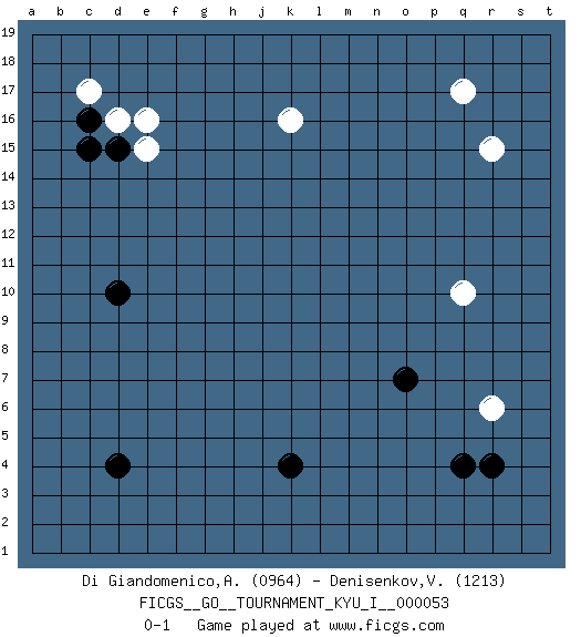 Last move : 0-1 2014 June 23 23:38:11 [Event "FICGS__GO__TOURNAMENT_KYU_I__000053"] [Site "FICGS"] [Date "2014.04.26"] [Round "1"] [Black "Di Giandomenico,Alfonso"] [White "Denisenkov,Valentin"] [Result "0-1"] [Rating 1 "0964"] [Rating 2 "1213"] 1.d4 q17 2.q4 d16 3.d10 r15 4.k4 r6 5.d15 e15 6.c15 e16 7.r4 q10 8.o7 k16 9.c16 c17 0-1 This go game has been lost on time (started : 2014.04.26 1:29:5) Here are the names of the openings (joseki) played in the four corners : Corner q4 : q4 r6 Hoshi (Hwajeom, Seongjeom, Xingwei`) 4-4 Point. The star or hoshi (4-4) point, emphasizing influence at the potential expense of territory. Ikken Kakari (Hankan Keolch'im, Yi Gua`jiao~, 1-Space Low Approach). White 2 is the standard approach move to the 4-4. Corner d16 : d16 d15 Hoshi (Hwajeom, Seongjeom, Xingwei`) 4-4 Point. The star or hoshi (4-4) point, emphasizing influence at the potential expense of territory. Player White won this Go (weiqi, baduk) game. Follow this game move after move (download)Big groups never die. (Anonymous) The bottom line is always the bottom line. (Johann Piek)