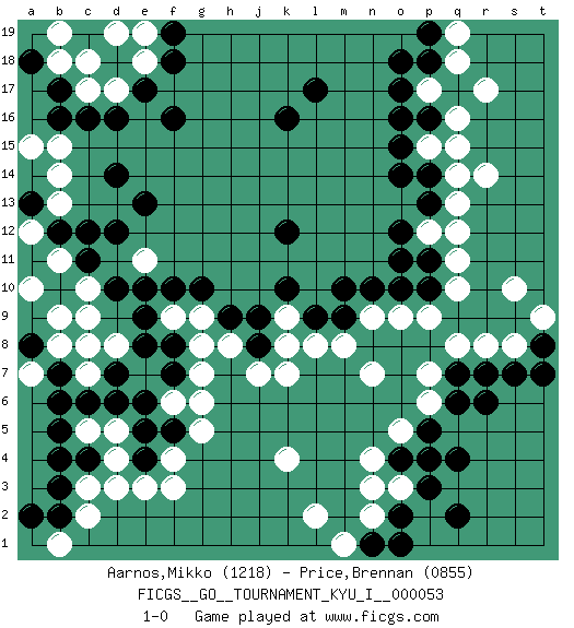 Last move : 1-0 2014 December 6 23:33:36 [Event "FICGS__GO__TOURNAMENT_KYU_I__000053"] [Site "FICGS"] [Date "2014.04.26"] [Round "1"] [Black "Aarnos,Mikko"] [White "Price,Brennan"] [Result "1-0"] [Rating 1 "1218"] [Rating 2 "0855"] 1.k10 d4 2.c6 f3 3.d16 q16 4.q4 q10 5.o17 r14 6.k16 k4 7.d10 o3 8.r6 r8 9.o14 k7 10.g10 g8 11.o11 o9 12.q2 o5 13.e6 g6 14.f16 p17 15.p16 p15 16.o16 r17 17.o2 n2 18.p3 n4 19.n10 n7 20.e9 c17 21.c16 d17 22.e17 e18 23.f18 d19 24.b17 b18 25.b16 c18 26.f19 e19 27.b4 c3 28.k12 p12 29.p18 q18 30.p11 q11 31.o12 q13 32.n1 m1 33.o1 l2 34.b3 c8 35.d7 c10 36.c11 c9 37.d12 b11 38.b12 a10 39.b7 c5 40.c4 d5 41.b5 c2 42.f7 g7 43.l17 p7 44.p5 p6 45.q6 n9 46.a18 b19 47.s7 s8 48.e5 f4 49.e4 e3 50.d6 d3 51.h9 h8 52.m9 m8 53.p14 q14 54.j8 j7 55.t8 t9 56.t7 s10 57.l9 l8 58.p19 q19 59.o18 k8 60.j9 k9 61.p13 q12 62.o15 q15 63.m10 g9 64.f10 f9 65.f8 c7 66.b2 b1 67.a2 b8 68.p4 a7 69.b6 b9 70.a8 e11 71.e10 d8 72.e8 f6 73.f5 g5 74.o4 n3 75.q7 q8 76.p10 p9 77.e13 b13 78.c12 a12 79.o10 b14 80.r7 b15 81.d14 a15 82.a13 1-0 Here are the names of the openings (joseki) played in the four corners : Corner d4 : d4 c6 Hoshi (Hwajeom, Seongjeom, Xingwei`) 4-4 Point. The star or hoshi (4-4) point, emphasizing influence at the potential expense of territory. Ikken Kakari (Hankan Keolch'im, Yi Gua`jiao~, 1-Space Low Approach). Black 2 is the standard approach move to the 4-4. Corner q16 : q16 o17 Hoshi (Hwajeom, Seongjeom, Xingwei`) 4-4 Point. The star or hoshi (4-4) point, emphasizing influence at the potential expense of territory. Ikken Kakari (Hankan Keolch'im, Yi Gua`jiao~, 1-Space Low Approach). Black 2 is the standard approach move to the 4-4. Corner q4 : q4 o3 Hoshi (Hwajeom, Seongjeom, Xingwei`) 4-4 Point. The star or hoshi (4-4) point, emphasizing influence at the potential expense of territory. Ikken Kakari (Hankan Keolch'im, Yi Gua`jiao~, 1-Space Low Approach). White 2 is the standard approach move to the 4-4. Player Black won this Go (weiqi, baduk) game. Follow this game move after move (download)Attach to the strongest stone in a pincer. (Anonymous) The quality of decision is like the well-timed swoop of a falcon which enables it to strike and destroy its victim. (Sun Tzu)